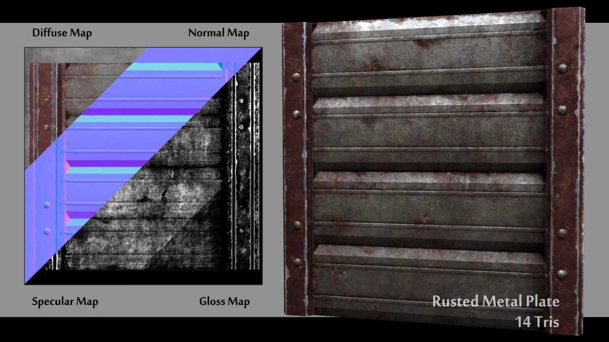 Rusted Metal Plate Maps Included are Normal, Diffuse, Gloss and Specular Map. All Maps are 2k Resolution ( 2048 x 2048 ) Files are in Targa Format.