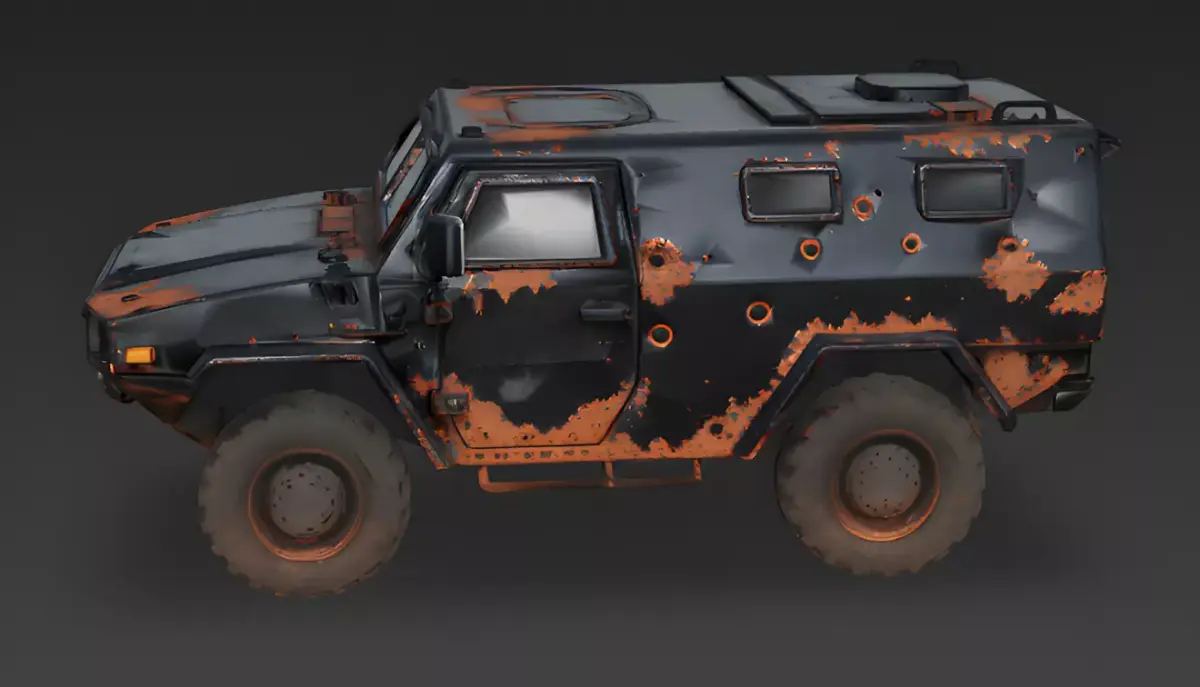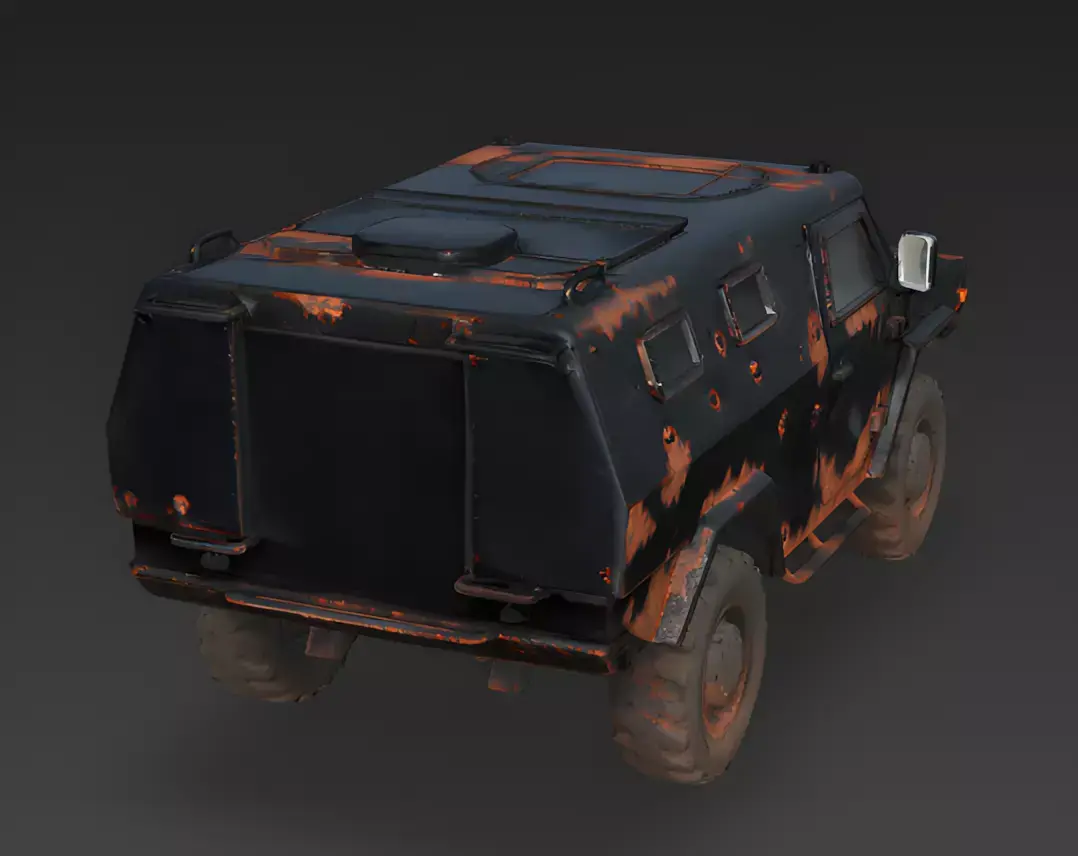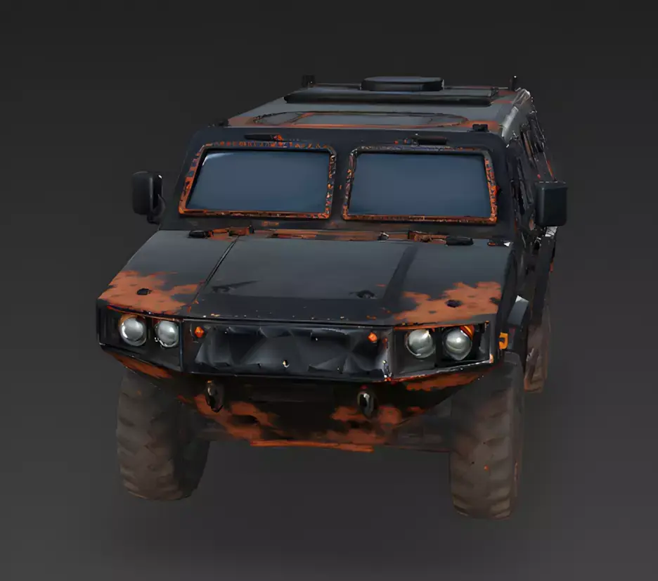 The Overall ConceptThis 3D model represents a rusted stealth Armored Personnel Carrier (APC) designed with a rugged, wasteland aesthetic. It features a low-profile, angular fuselage with heavy-duty off-road tires, making it an ideal choice for post-apocalyptic survival games or high-stakes desert combat scenarios.