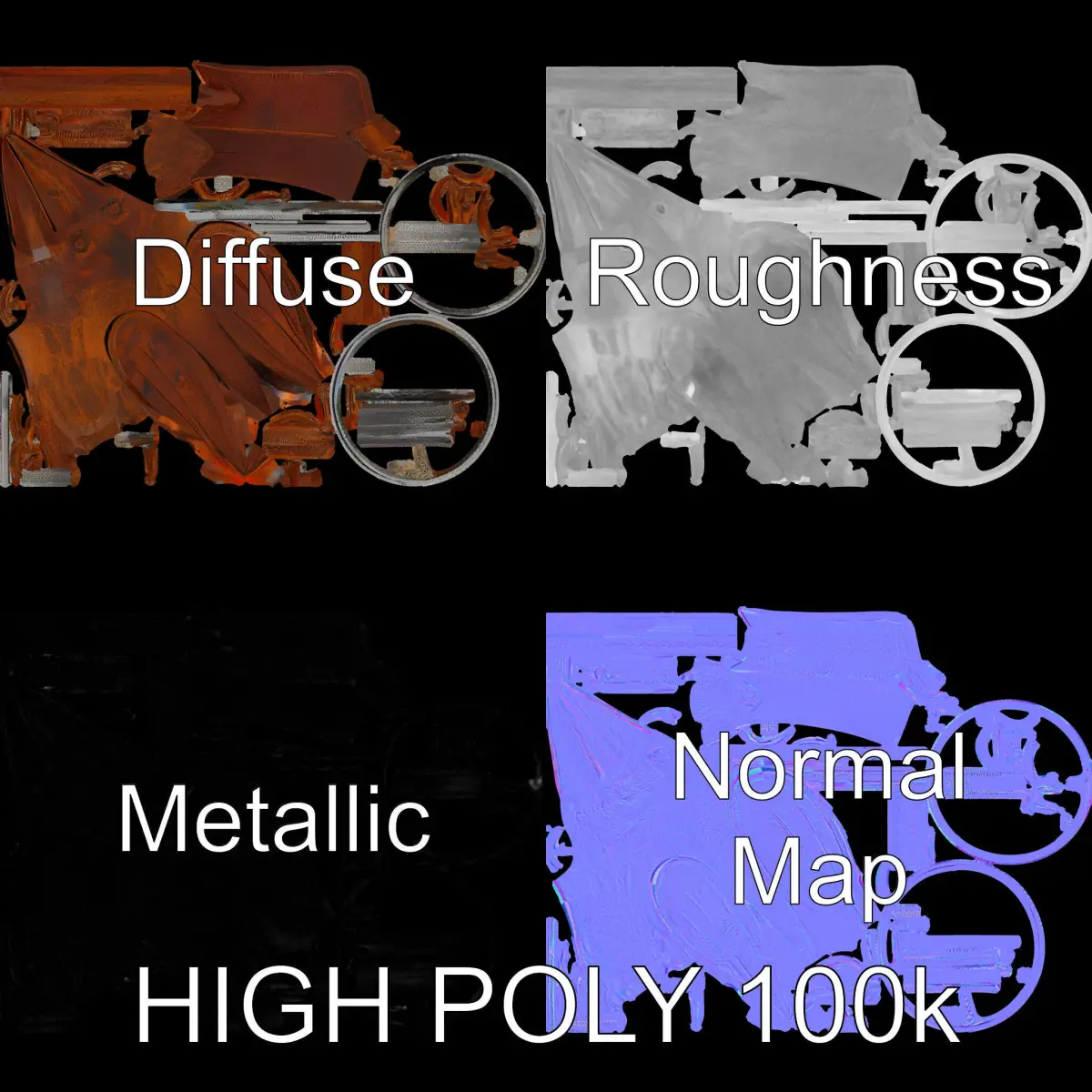 The model features rusty metal textures that lend a vintage, artisanal feel, ideal for rustic and industrial-themed scenes. Compatible with modern rendering engines, it comes with high-quality PBR textures including Diffuse, NormalMap, and reflection/roughness/metallic maps, all at 4096x4096 resolution. The model is meticulously unwrapped with no overlapping UVs, ensuring optimal texture performance.