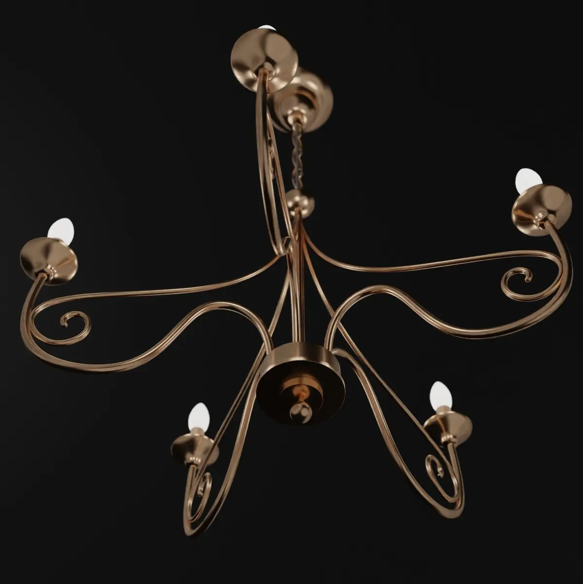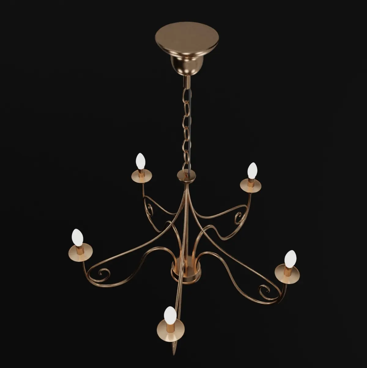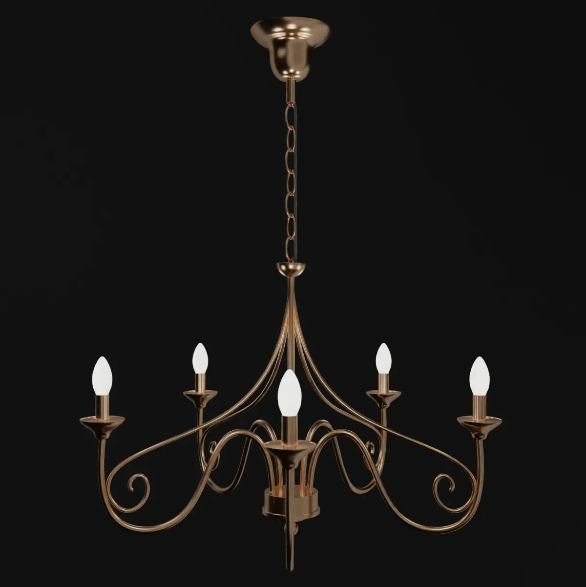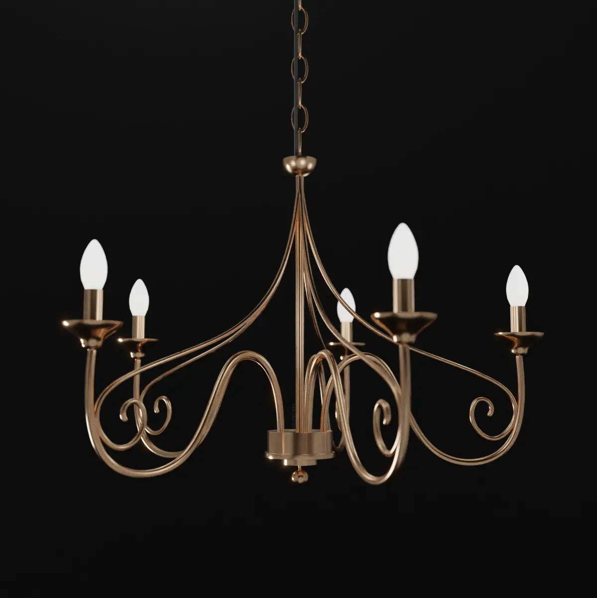 Rustic chandelier on a chain in gold finish. The material is metal with gold shiny paint. The cable is in black rubber. I have used a candelabra bulb, but you can change it.
