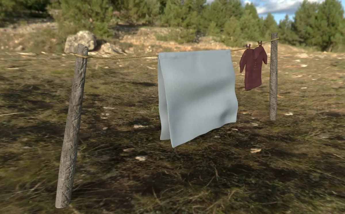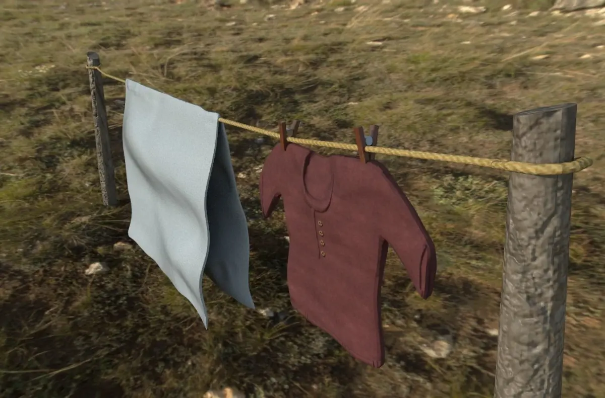 A rustic clothesline made of two wooden posts and rope. Hanging are a white linen blanket and a red shirt. Perfect for historical settings.