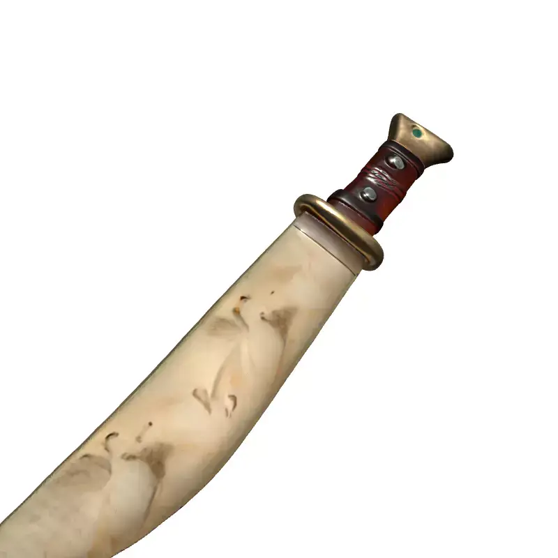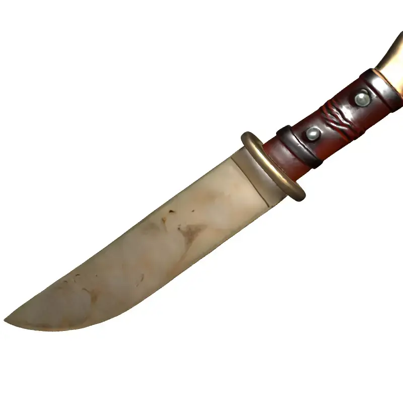 This is a meticulously crafted 3D model of a rustic combat or hunting knife, featuring a weathered blade and an elaborately designed handle. The blade exhibits realistic wear and scratches, giving it an authentic, aged appearance, perfect for a gritty, lived-in feel. The hilt is composed of a rich, dark wood or leather-wrapped grip, secured with rivets, and capped with an elegant, bone-like pommel adorned with a striking green gemstone inlay. A brass-colored guard separates the blade from the handle, adding to its robust construction and aesthetic appeal. This versatile model is ideal for a wide range of digital projects, including immersive game development (fantasy, survival, historical RPGs), realistic architectural visualizations as a prop, engaging augmented reality (AR) and virtual reality (VR) applications, and detailed digital art compositions. It is optimized for real-time rendering environments, ensuring smooth performance in interactive experiences, while also being perfectly suited for high-quality static renderings and cinematics. The model boasts clean, efficient topology, making it easy to integrate into any scene, and is fully UV unwrapped with comprehensive PBR (Physically Based Rendering) textures for maximum visual fidelity and realism across various lighting conditions. Supported file formats include GLB, OBJ, STL, ABC, DAE, FBX, USD, and PLY, ensuring broad compatibility with major 3D software and game engines.