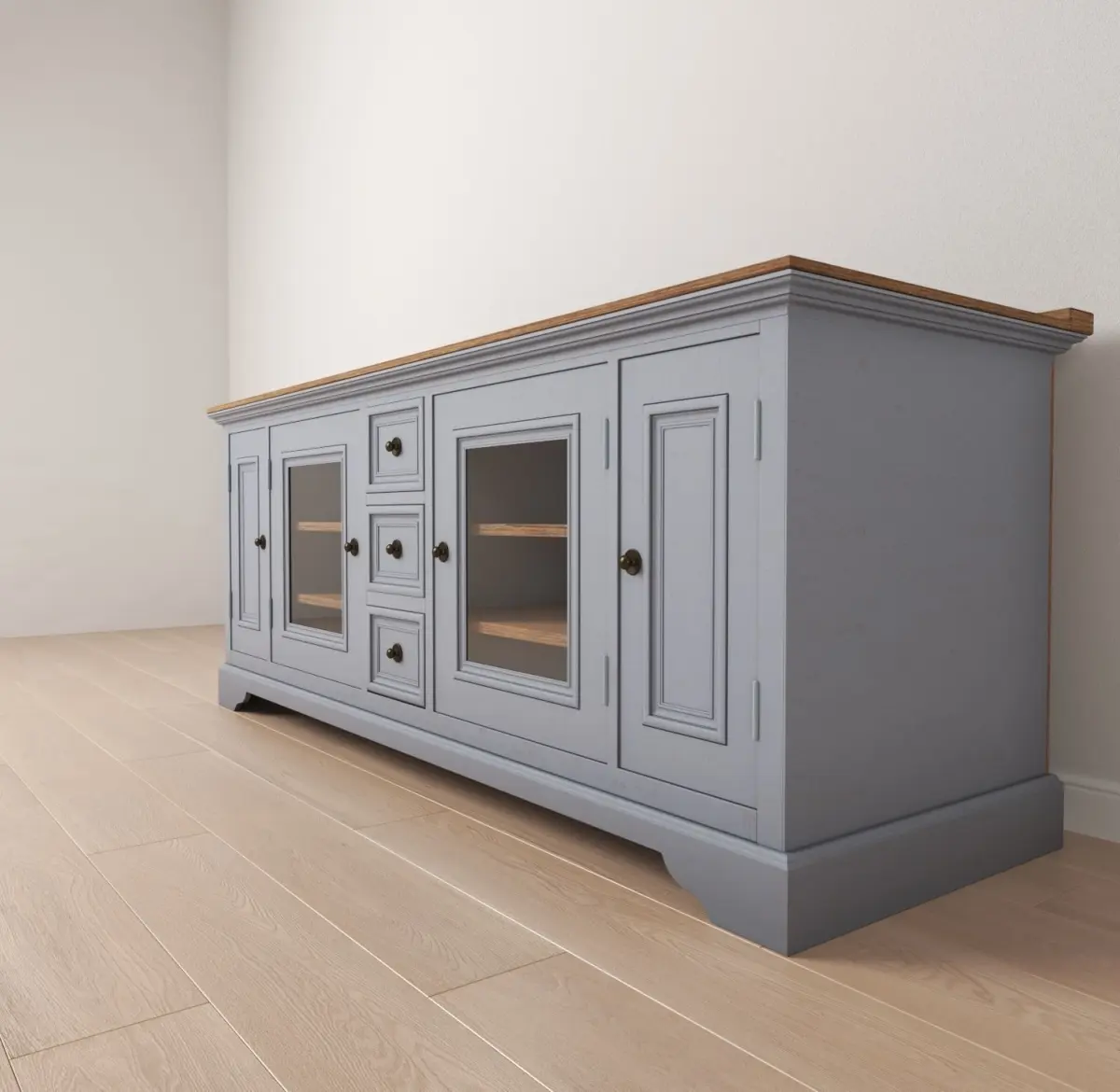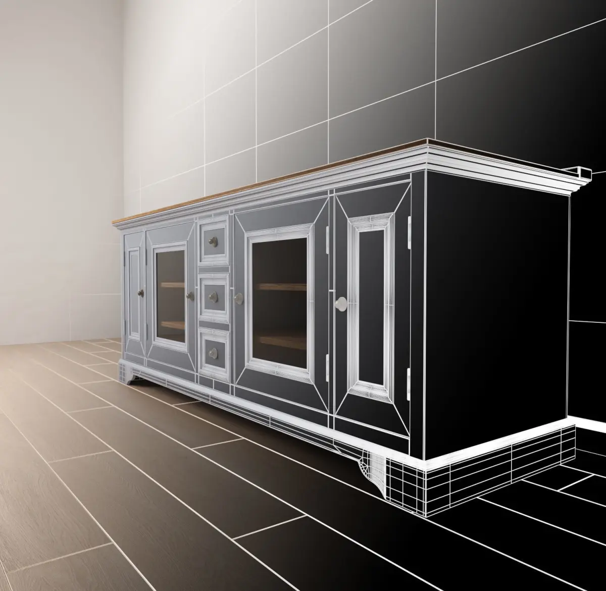 A beautiful timeless piece for your architectural rendering needs. This entertainment center is 70 inches long and 2.5 feet wide. Beautifully painted with a brushing that lets the oak seap through. This piece is sure to make any architectural rendering beautiful!