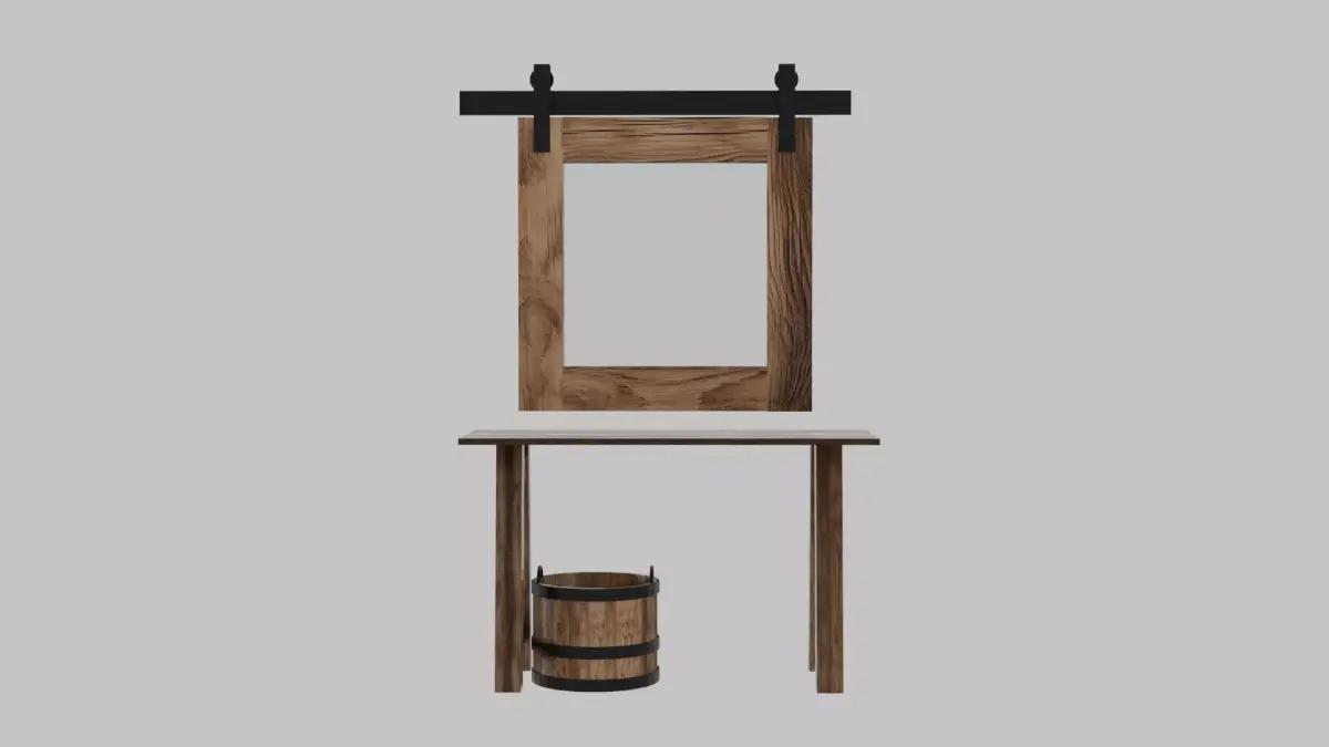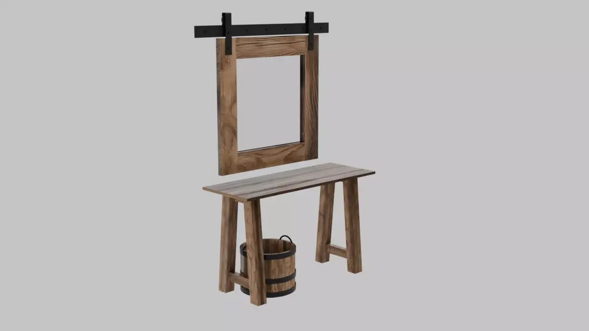 Separate Components: Each item (table, mirror, bucket) is a distinct model, allowing for easy repositioning or use in other scenes.