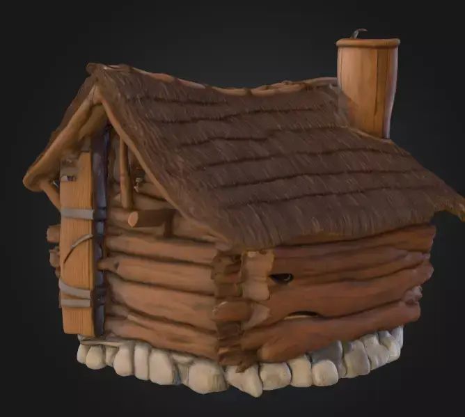 The Rustic Fantasy Wooden Cabin is a uniquely designed 3D model that blends charm, strength, and mystical atmosphere. Its squat, irregular structure gives it a handcrafted, almost enchanted appearance, perfect for fantasy and medieval settings. The steeply pitched thatched roof, partially reinforced with rough dark logs, is adorned with curved wooden accents resembling horns, enhancing its otherworldly and tribal aesthetic.
