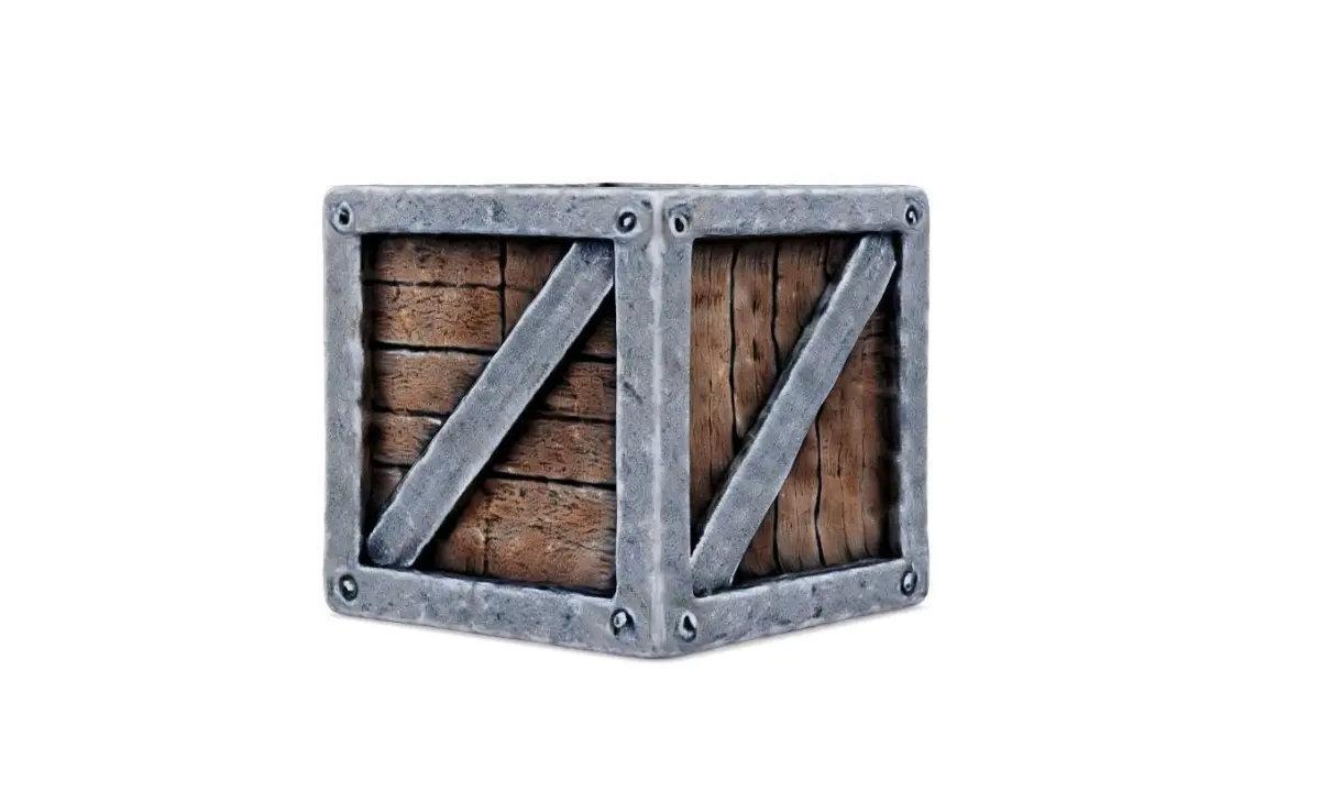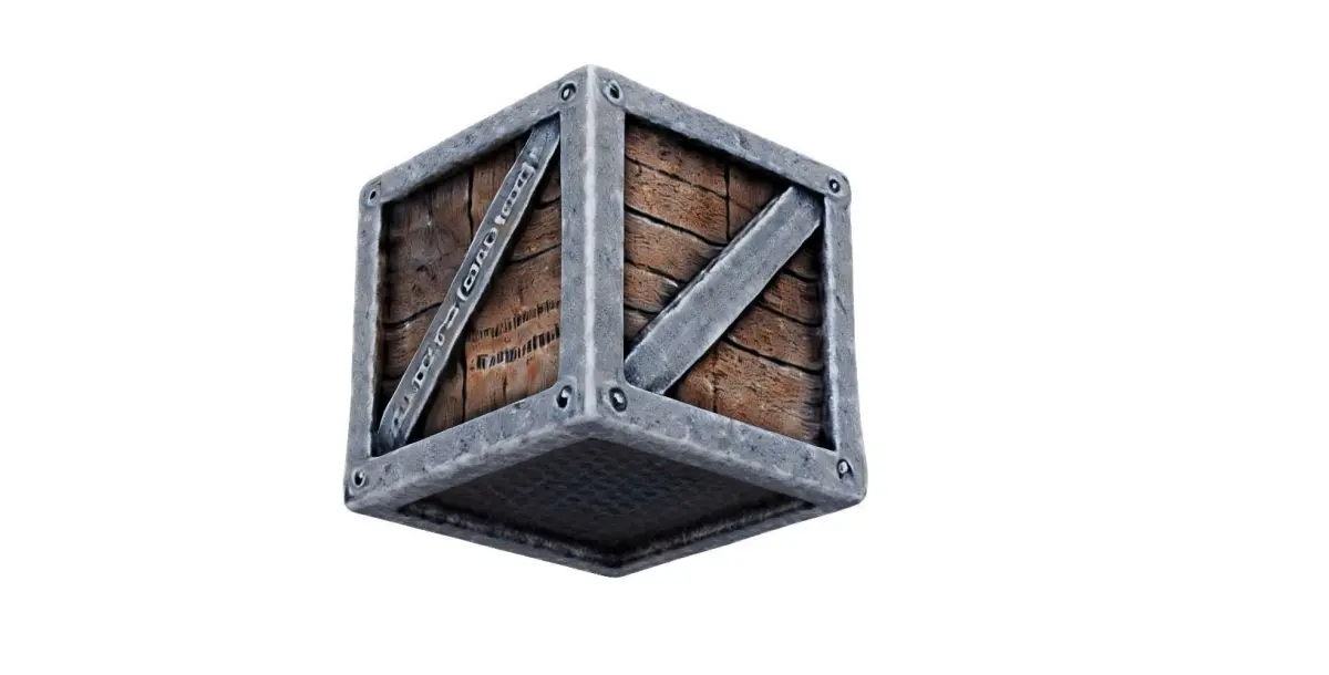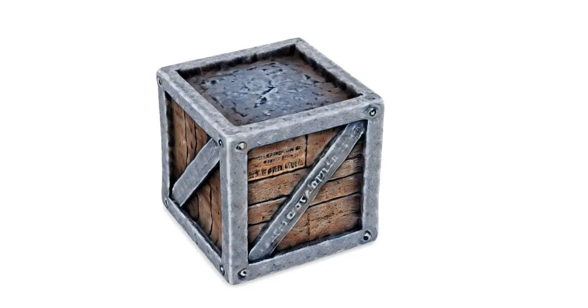 The 3D model depicted is a finely crafted representation of a rustic industrial crate, featuring a blend of weathered wooden textures and sturdy metal reinforcements. The model exhibits a high level of detail, showcasing realistic textures that give the impression of aged wood and worn metal surfaces. This model would be ideal for game environments, architectural visualizations, or any virtual scene requiring a touch of vintage industrial aesthetics.
