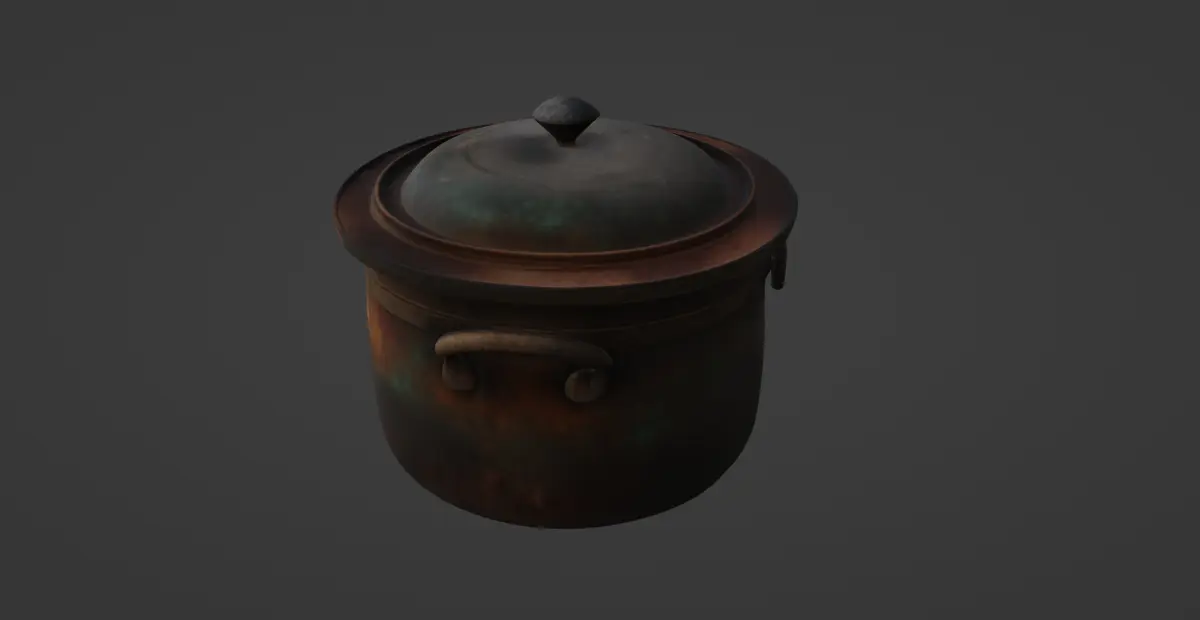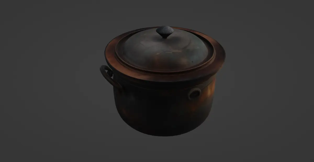 This 3D model represents a rustic iron cooking pot complete with a matching lid, exuding the patina and wear of long use over open flames. The surface texture features layers of oxidation and age, giving it a weathered and authentic antique appearance. The pot is modeled with robust iron handles on either side, affixed with circular brackets for added realism and historical accuracy.The model is ideal for scenes requiring historically accurate kitchenware, from medieval to early industrial settings. It works beautifully in period-piece animations, survival game props, or museum-style digital exhibitions. The lid is fully modeled to sit naturally atop the pot, and the looped handle at the top reinforces the hand-forged aesthetic.High-resolution textures accompany the model, including detailed rust maps and surface irregularities that help deliver a photorealistic result when rendered. It is crafted to provide optimal performance in both cinematic renders and real-time applications, offering a good balance of polygon detail and texture fidelity.This model is downloadable in .gmb format, and it includes the texture. It is also available in .fbx format for broader compatibility across 3D platforms and game engines.