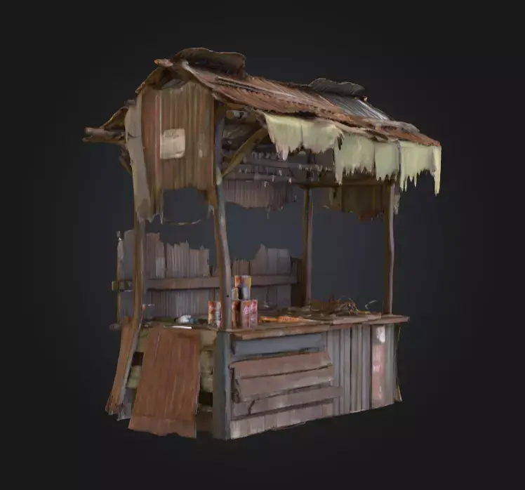 The stall is constructed from sturdy wooden beams and simple planks, reinforced by its slightly uneven, handcrafted design. Its defining feature is a draped fabric canopy, aged yet vibrant, offering both shelter and character. The wood carries a warm, weathered tone with visible grain patterns, subtle wear, and painted details that emphasize its rustic charm. The cloth covering is hand-painted with folds, shading, and slight irregularities, giving it a lived-in, story-rich aesthetic.
