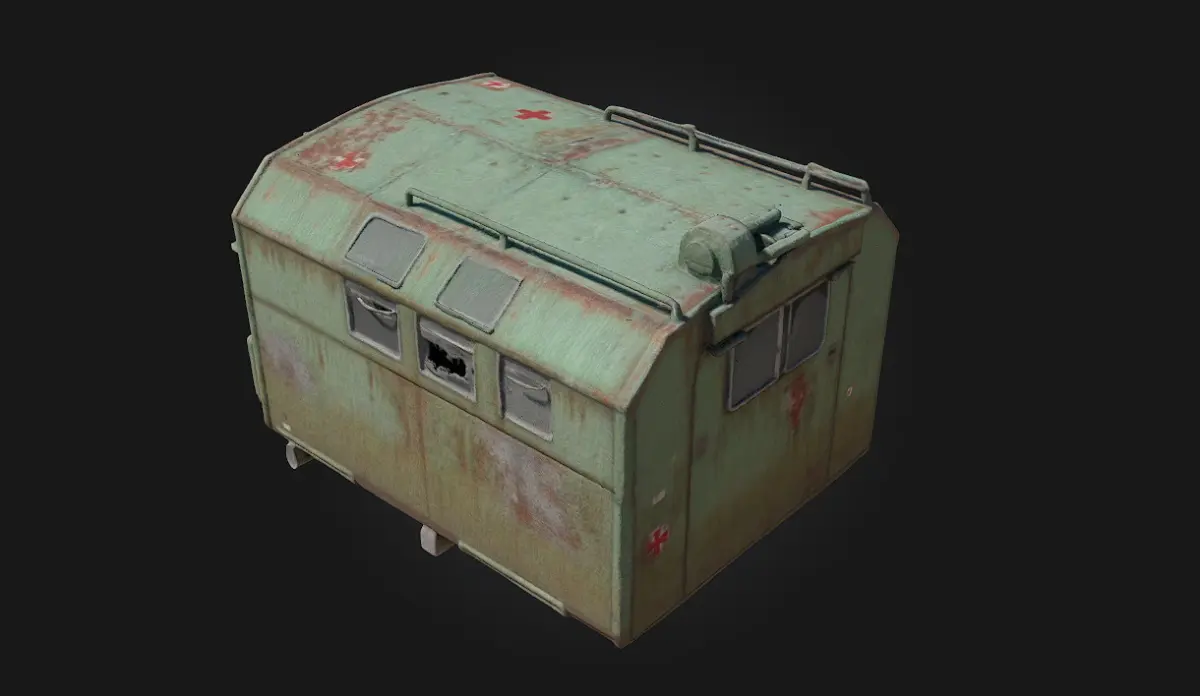 The Rustic Medical Shelter model represents a humble yet essential structure, perfect for survival, post-apocalyptic, or medieval settings. With its rugged wooden frame, canvas coverings, and functional interior, this shelter evokes the spirit of care and resilience in harsh environments.