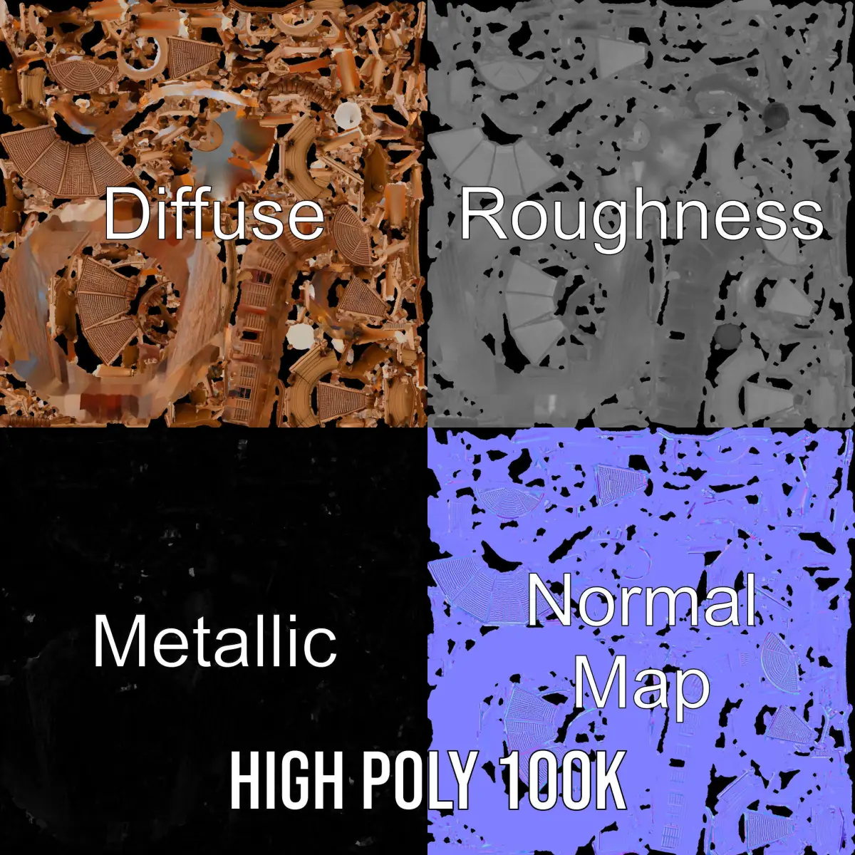 This Rustic Octagonal Gazebo Wooden Structure 3D Model Pack offers three levels of detail: low-poly, mid-poly, and high-poly, making it ideal for various applications such as video games, architectural visualization, and virtual reality experiences. The model is designed with precision, ensuring seamless integration into production renderings and game engines like Unity and Unreal. Its PBR textures, including Diffuse, NormalMap, and reflection/roughness/metallic, are optimized for any modern rendering software. All models come with 4096x4096 textures, are accurately unwrapped, and have no overlapping UVs. Perfect for outdoor architectural scenes, garden designs, and landscaping projects.