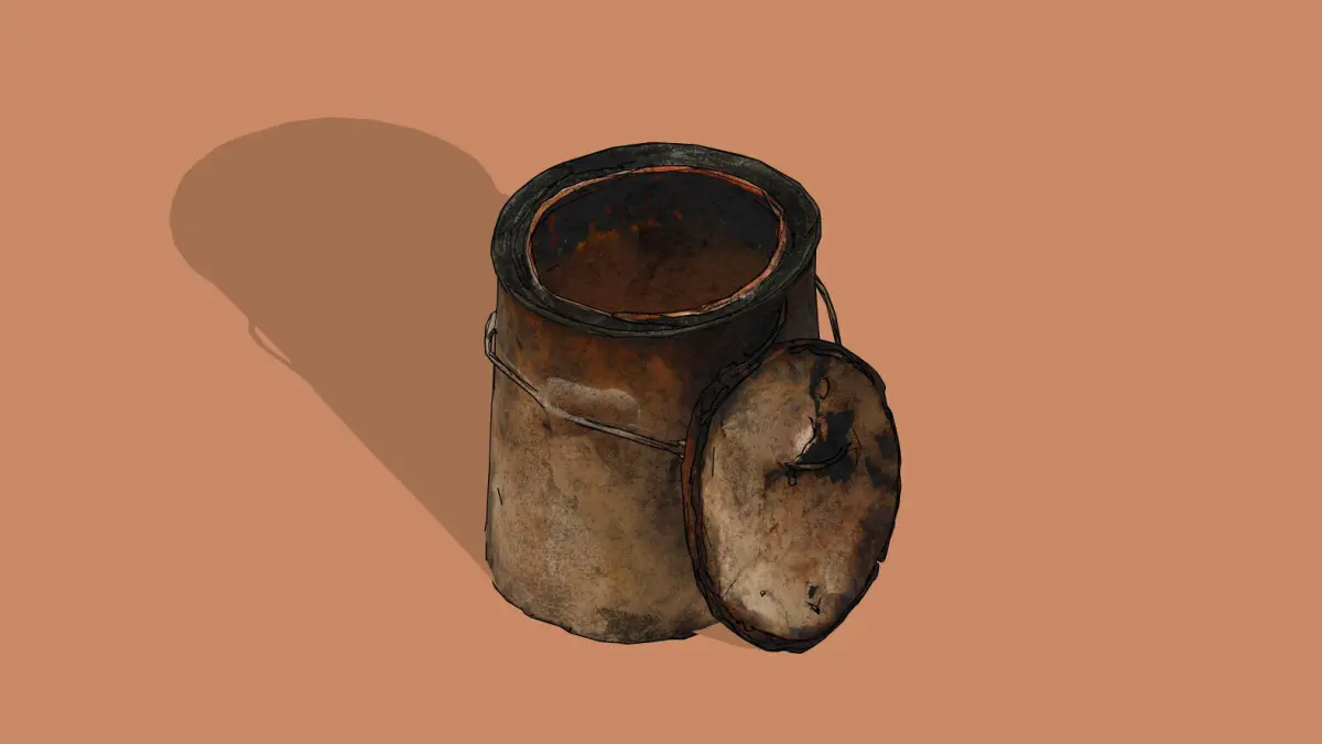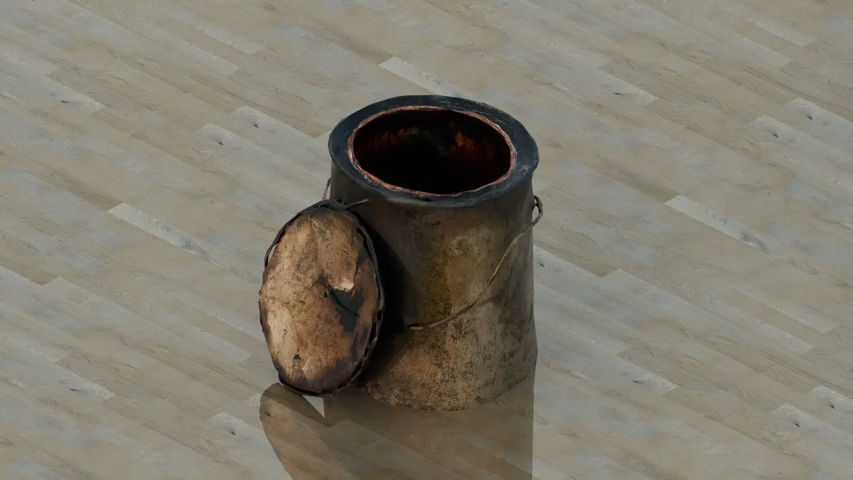 This 3D low-poly model depicts a weathered paint can, rusted and worn, with its lid detached and placed beside it. The can’s surface shows signs of age with peeling paint and grime, set against a simple wooden floor. This model is ideal for adding a touch of decay to industrial scenes, abandoned settings, or digital projects focused on neglect and deterioration.