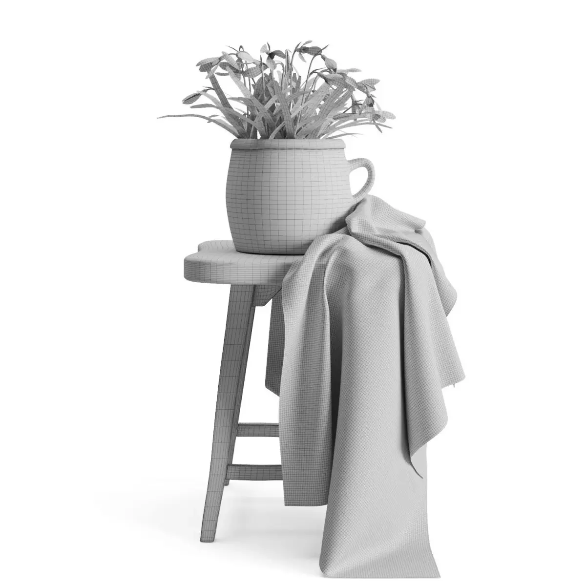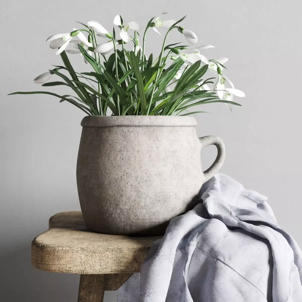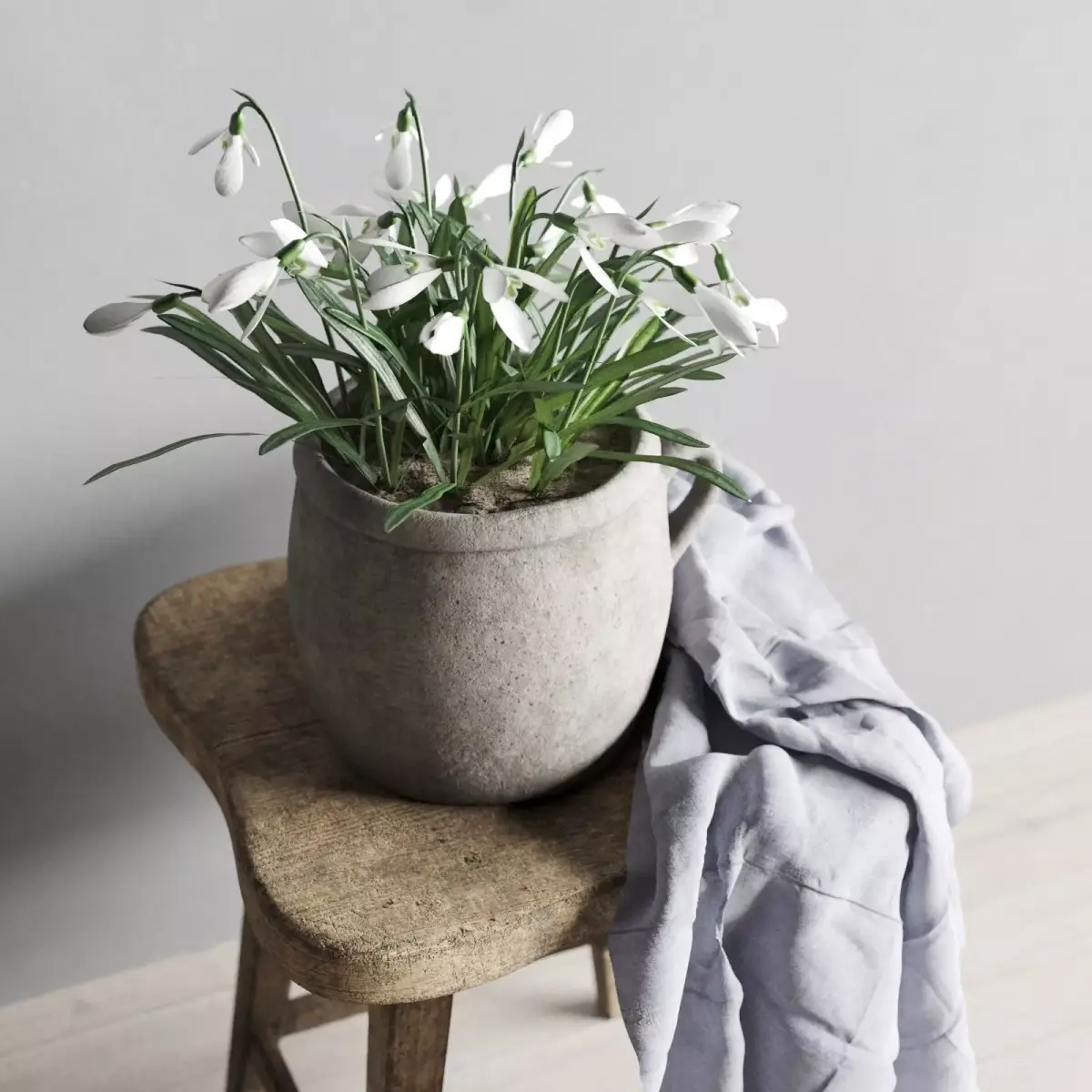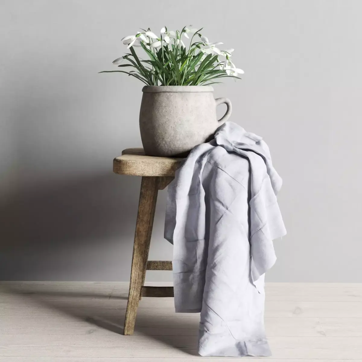 A realistic 3D set in rustic style featuring a bouquet of snowdrops (Galanthus nivalis) arranged in a ceramic pot, placed on a wooden stool with a linen fabric.The composition conveys a calm spring atmosphere and natural handcrafted simplicity.All materials are made in PBR quality, with detailed ceramic, wood, and fabric textures.This scene is perfect for interior visualizations, still-life renders, and Scandinavian or cottage-style projects.