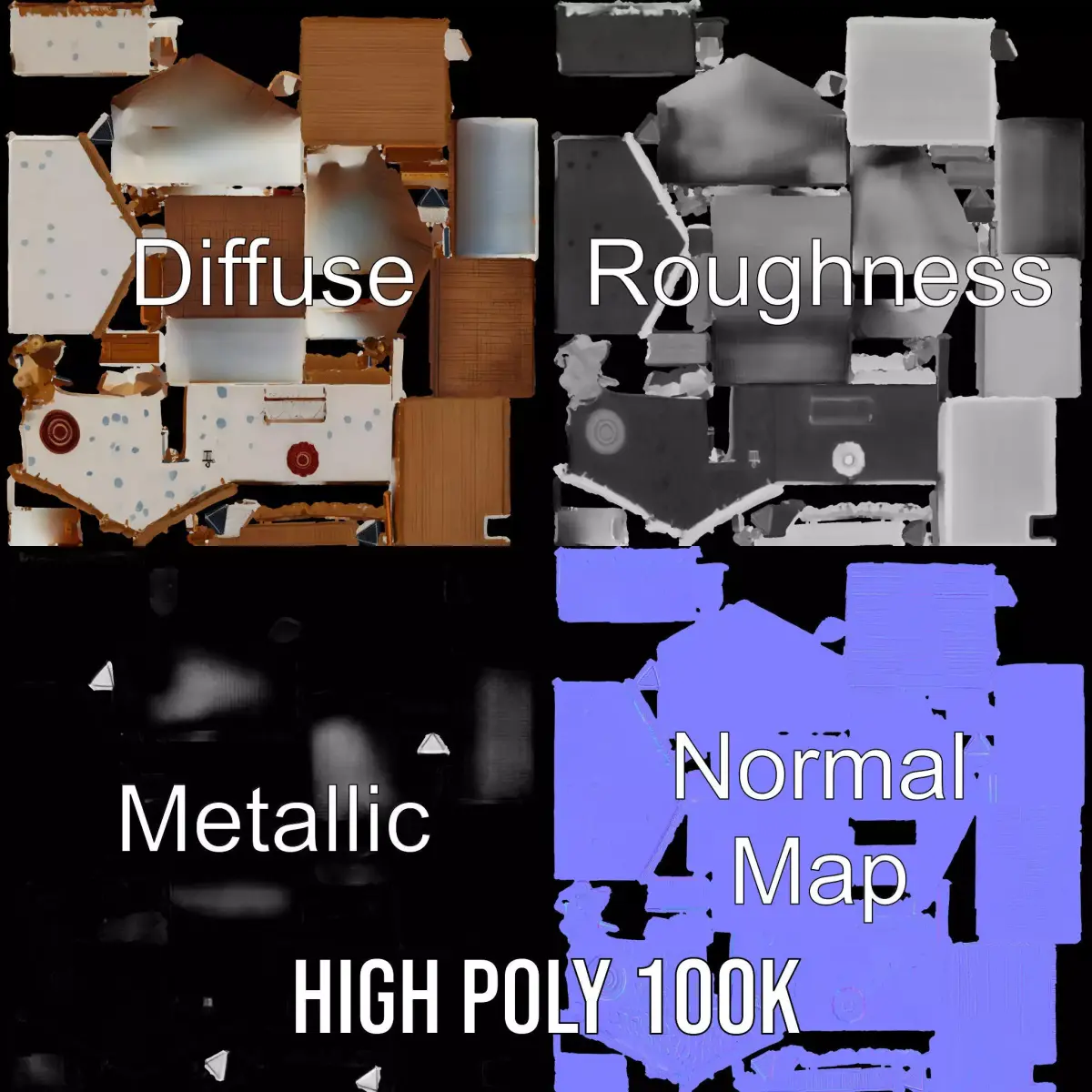 The Rustic Stone Cottage model pack features a charming stone cottage with a thatched roof, perfect for countryside or village scenes in games, animations, and architectural visualizations. Each model has 3 levels of detail: low-poly (1000 triangles for mobile), middle-poly (10,000 triangles for environment), and high-poly (100,000 triangles), which allows for the use of this model in production rendering (such as 3ds Max, Maya, Cinema 4D, Blender, Vray/Corona/Cycles and all others), game engines (Unity and Unreal compatible), and interactive presentations, providing a choice of detail based on the LOD System principle. Ideal for virtual reality experiences or historical projects. The model's textures are PBR, Diffuse, NormalMap, and reflection/roughness/metallic, which are suitable for any modern rendering engine. All models accurately unwrapped and have no overlapping UV. All textures are 4096*4096 in size. Please like and leave a comment for the model if you liked it.
