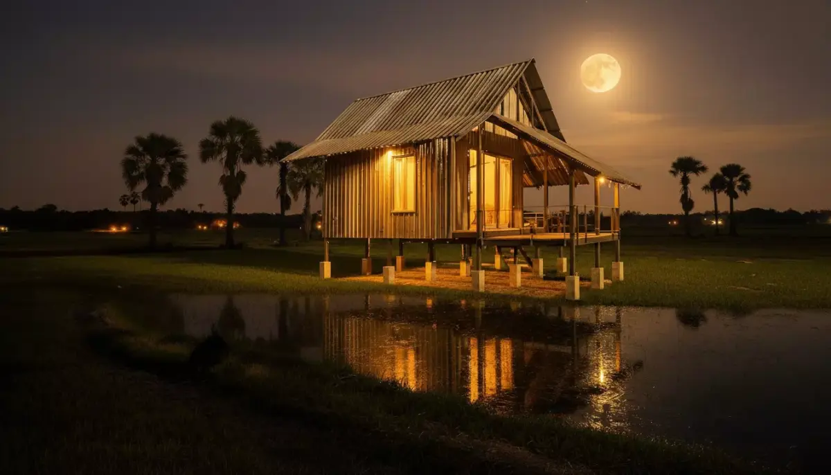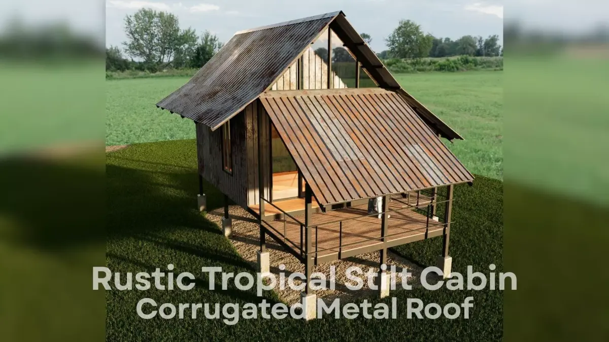 This 3D model presents a rustic tropical stilt cabin inspired by Southeast Asian vernacular architecture.The design features a raised structure on concrete footings, a lightweight steel frame, and a corrugated metal roof with weathered rust texture, blending traditional rural character with modern simplicity.Open verandas and deep roof overhangs provide shade and natural ventilation, making the model suitable for tropical environments.The clean geometry and realistic materials make it ideal for architectural visualization, resort concepts, rural housing, eco-lodges, and exterior scene rendering.The model focuses on exterior form, proportions, and material atmosphere, allowing flexibility for further detailing or customization in your workflow.