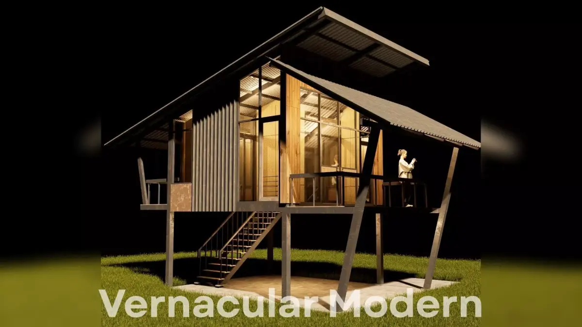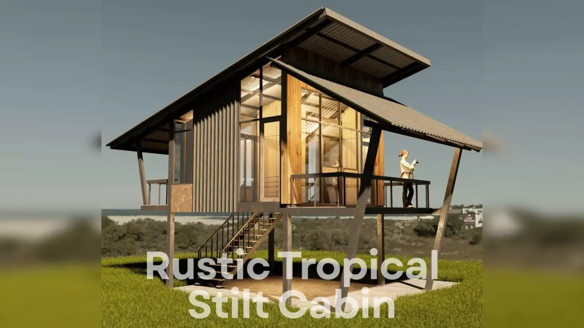 Modern Vernacular Tropical Stilt CabinA compact architectural 3D model designed with a warm rustic mood, elevated structure, and natural ventilation. This cabin blends corrugated metal sheets, weathered steel, warm timber, and tropical proportions — perfect for resort concepts, visualization, game environments, and architectural studies.