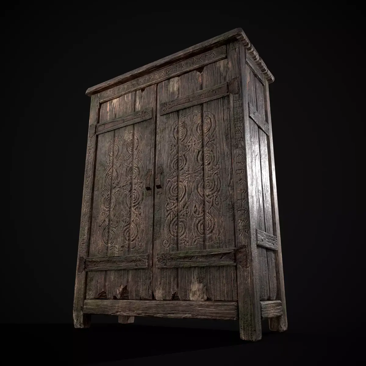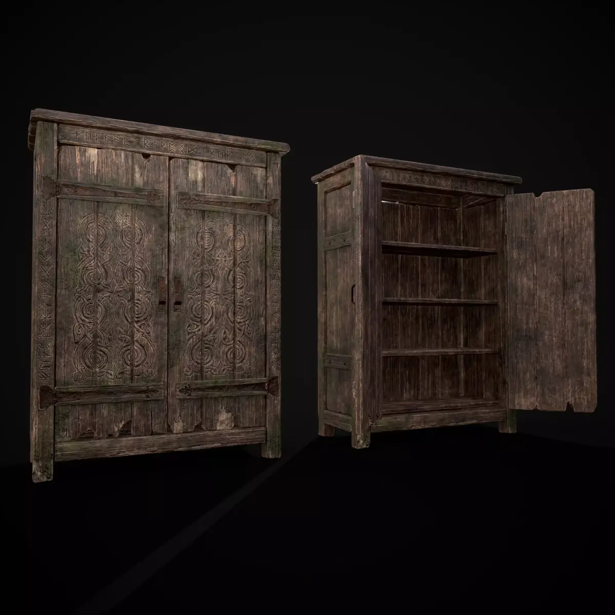 Rustic Viking Engraved Armoire - High Detail, Game Ready 3D Model - Files Include FBX and OBJ. Includes PBR Texture in 4096 x 4096. Maps include : Basecolor, Normal, Roughness, Height, and Metallic. All Preview renders were done Marmoset Toolbag 5. Scaled to real world scale. Customer Service Guaranteed. From the Creators at Get Dead Entertainment. Please like and Rate! Follow us on FaceBook and Instagram to keep updated on all our newest models. Model can be used for any purpose except resale or redistribution of the asset if not used in a game, commercial or media project.