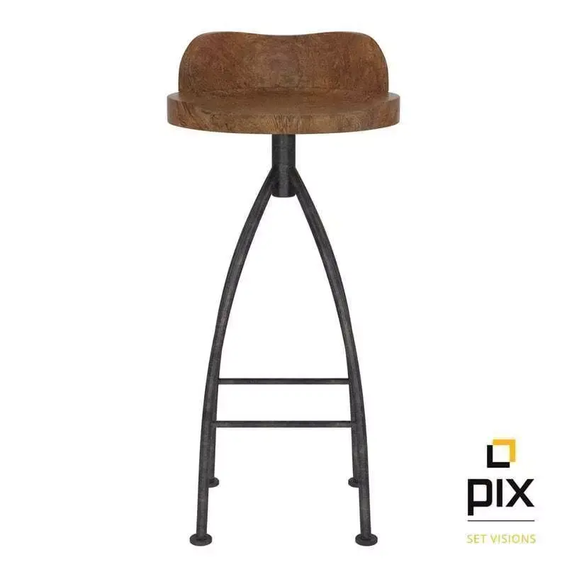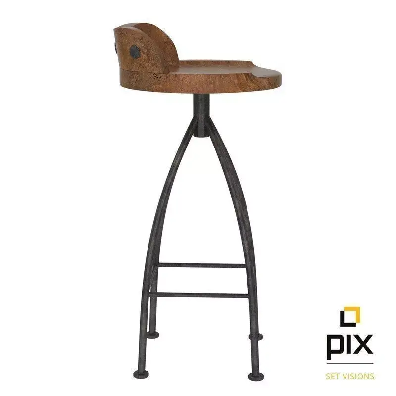 Realistic, fully textured model of a rustic bar stool with steel frame and solid wood seat.