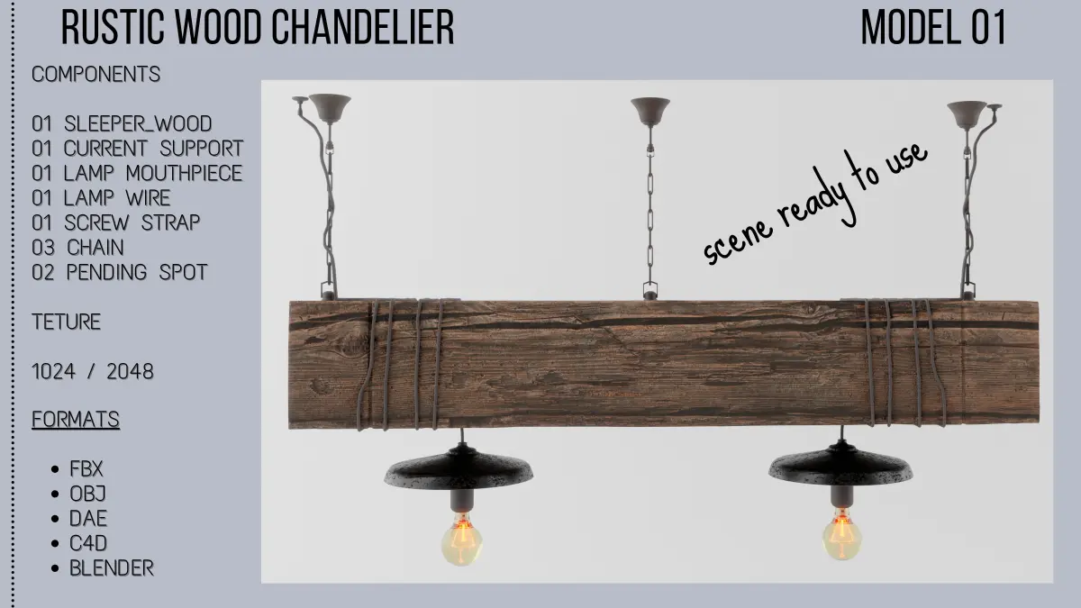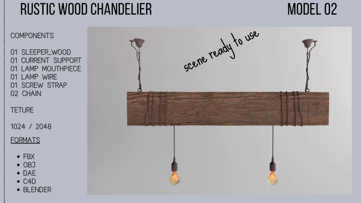 Rustic chandelier lamp model for scene compositions. High quality models in real measurements for your scenes. This template will save you time and increase the level of detail in your scene. Templates are mapped and ready to use. Compatible with Blender 2.90 or higher.