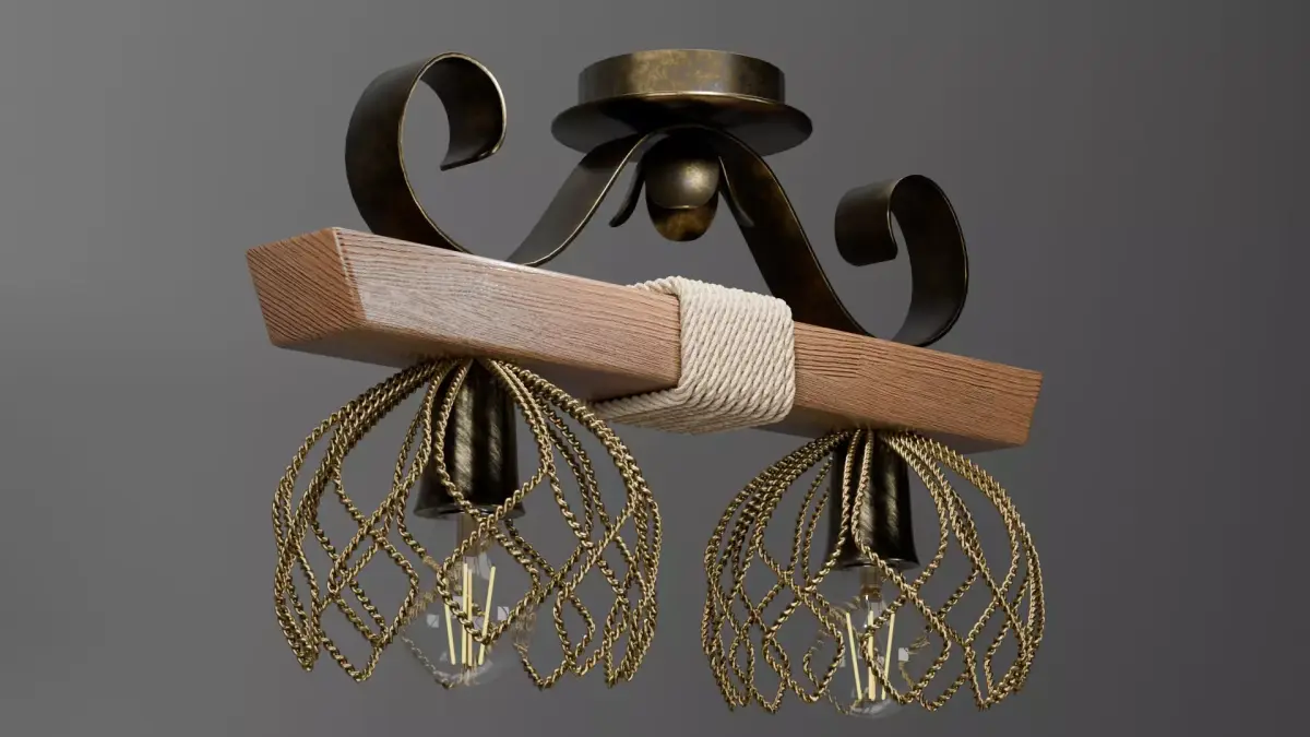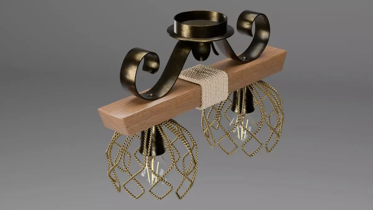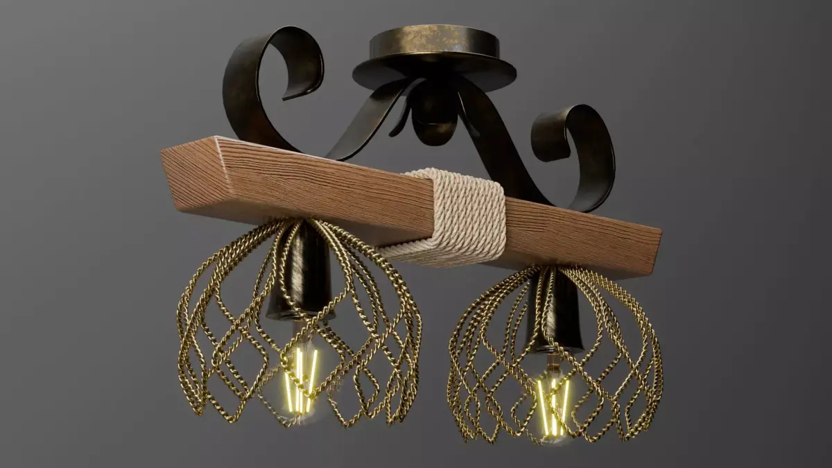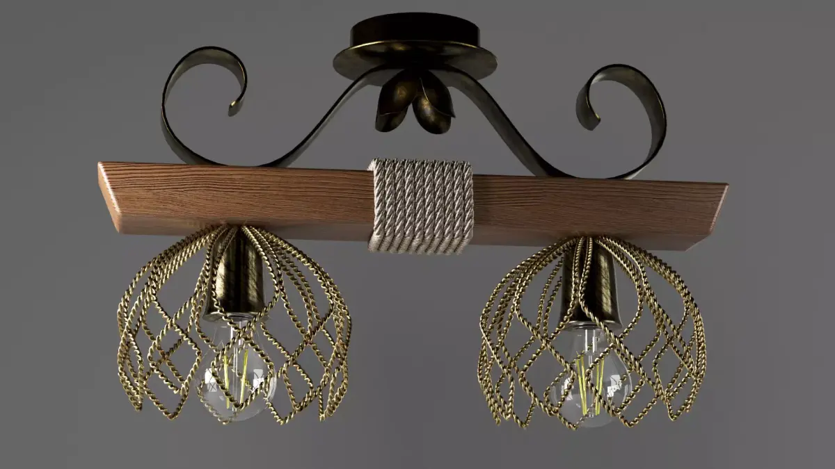 3D model of a rustic ceiling chandelier made of a wooden beam, decorative metal parts, and rope wrapping. The model includes two wire cage shades and LED filament bulbs.Technical Data: