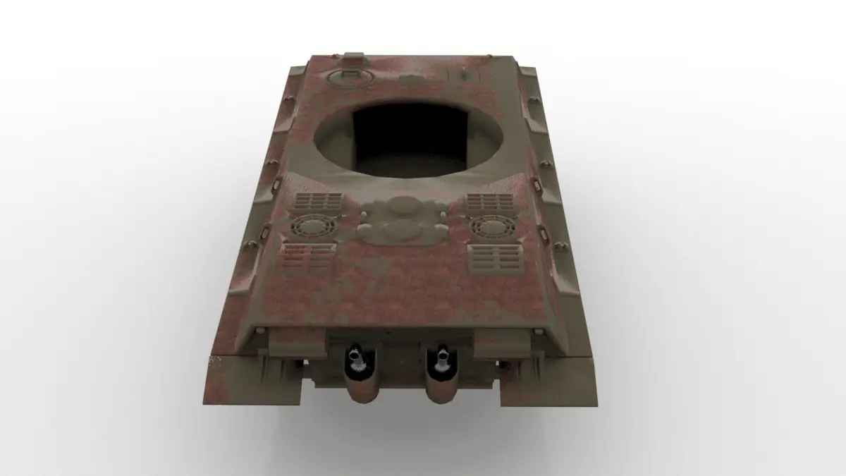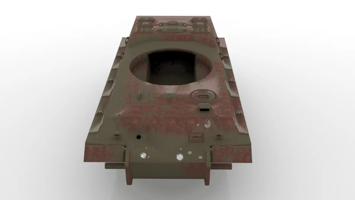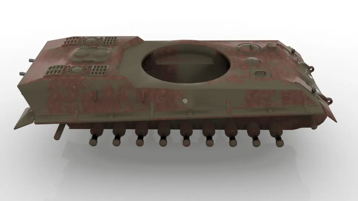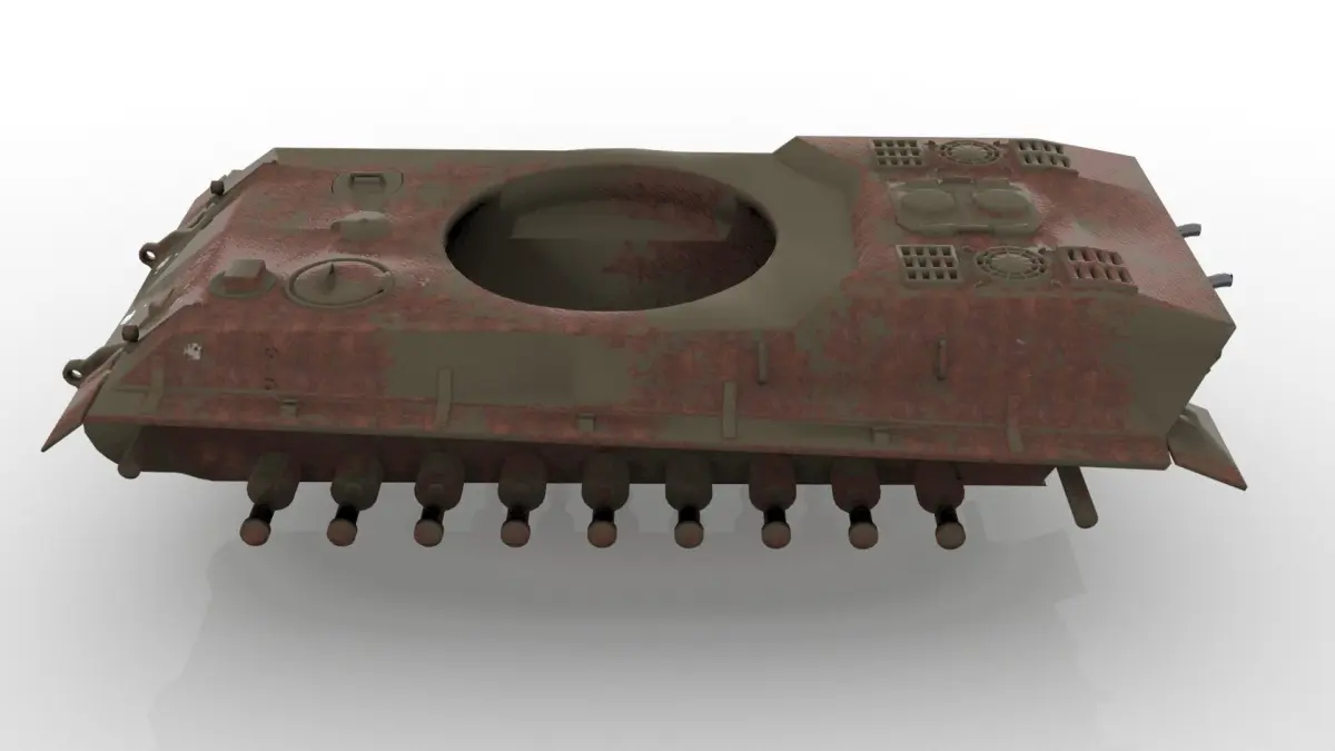 A world war 2 era generic heavy German tank chassis with rust and impact decals applied as PBR. Ready to be placed on an old field of battle or printed as this is a single closed mesh.