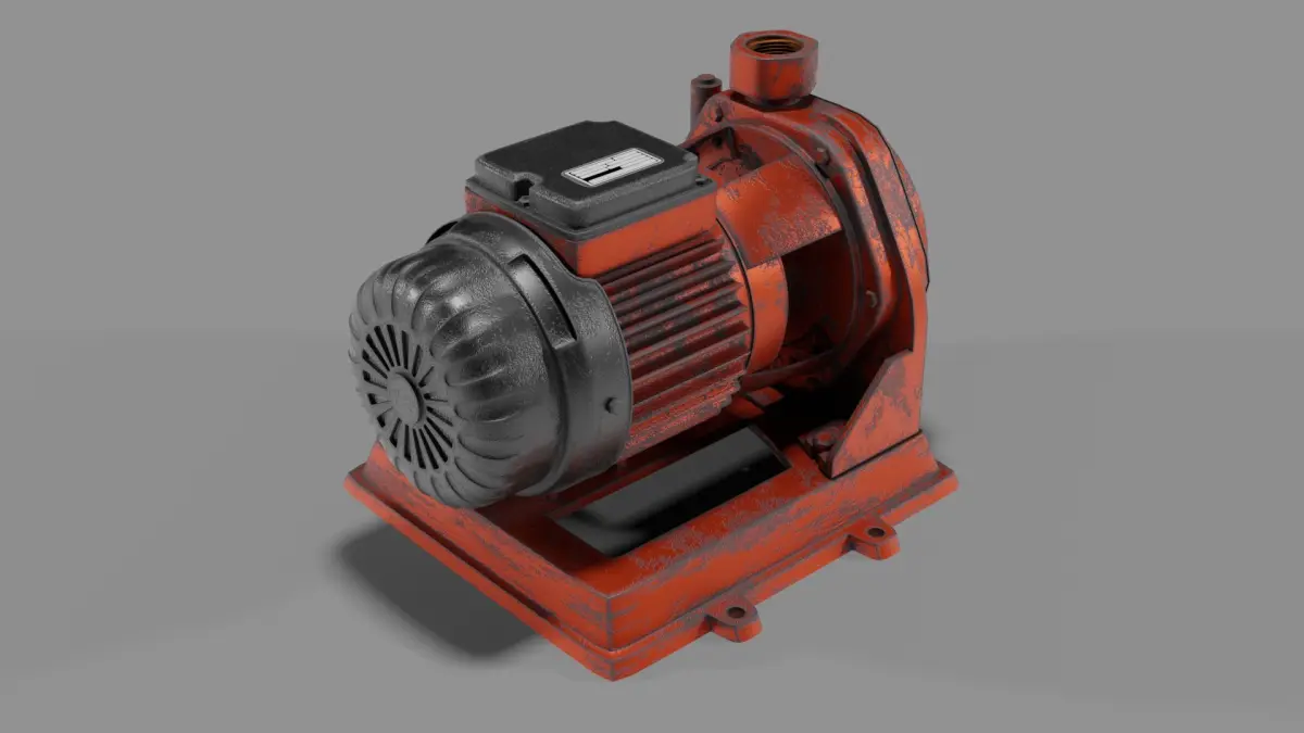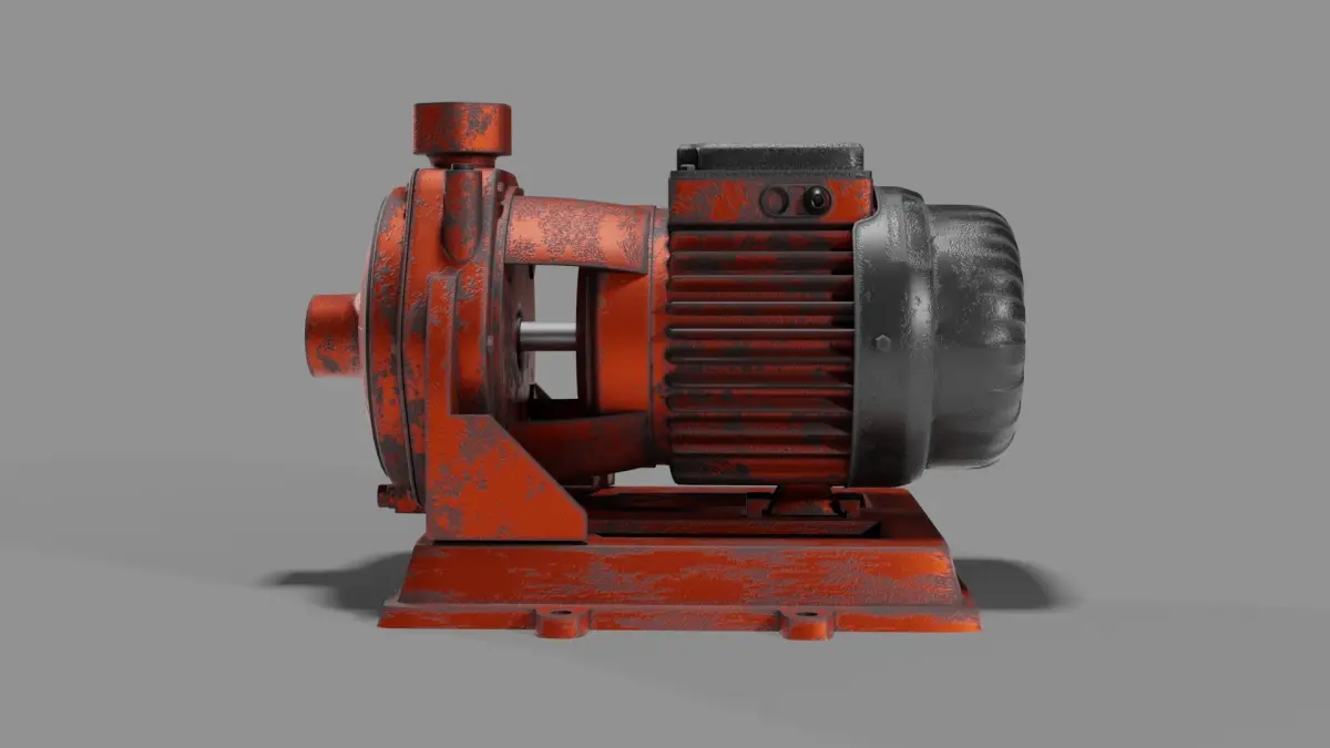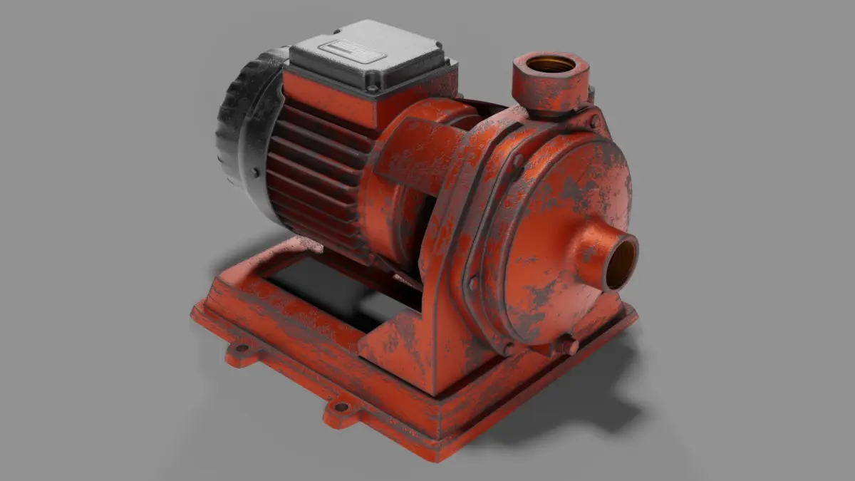 The Old Centrifugal Pump features a heavily worn painted metal surface with realistic oxidation and weathering details — ideal for depicting aged machinery or maintenance areas.