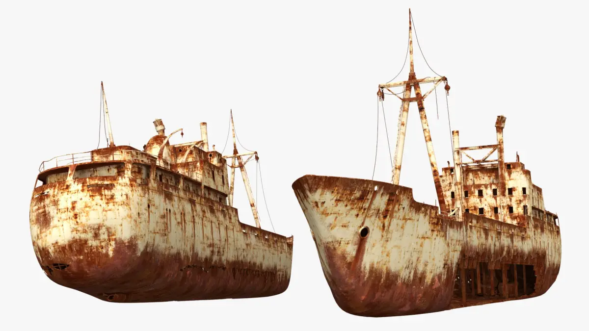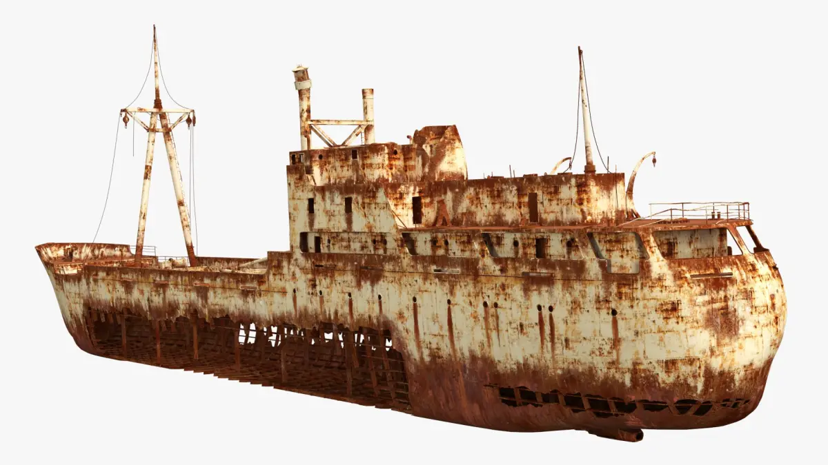 This model features the intricacies of rust and corrosion, with detailed textures highlighting the erosion and wear typical of an old shipwreck. The structure includes broken masts, weathered hull, and intricate rust patterns, capturing the essence of maritime decay.
