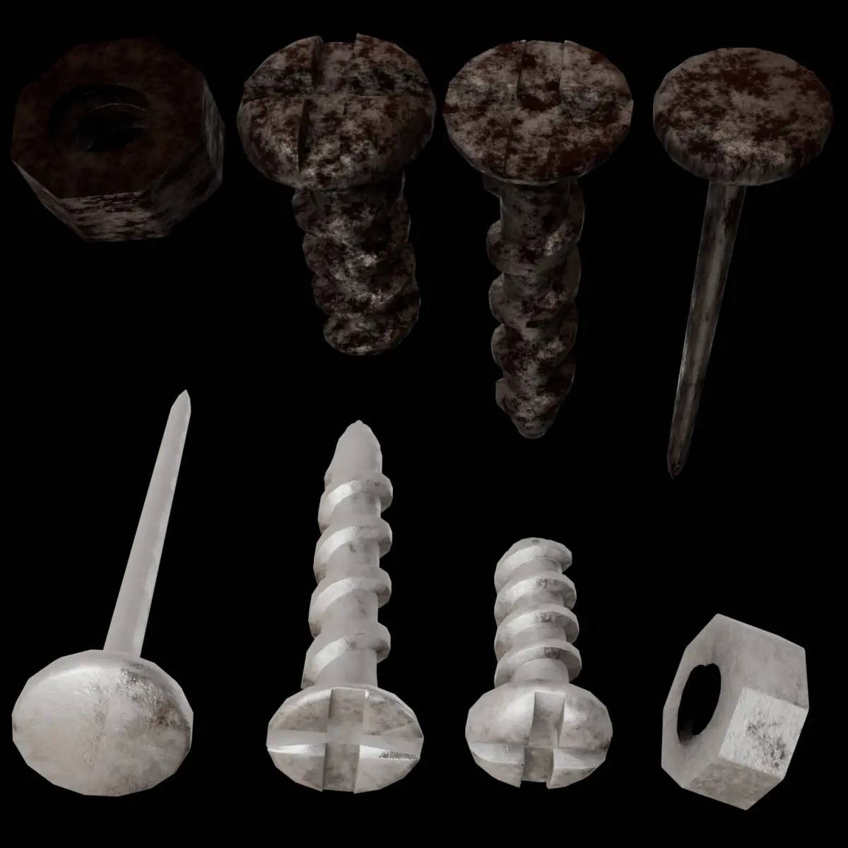Rusty Fasteners Pack is a collection of aged, game-ready fastening elements including nails, bolts, screws, and nuts — all with realistic rust and wear.Each object is low poly and includes a full PBR texture set: Base Color (rusty metal), Roughness, and Normal Map for maximum detail without heavy geometry.