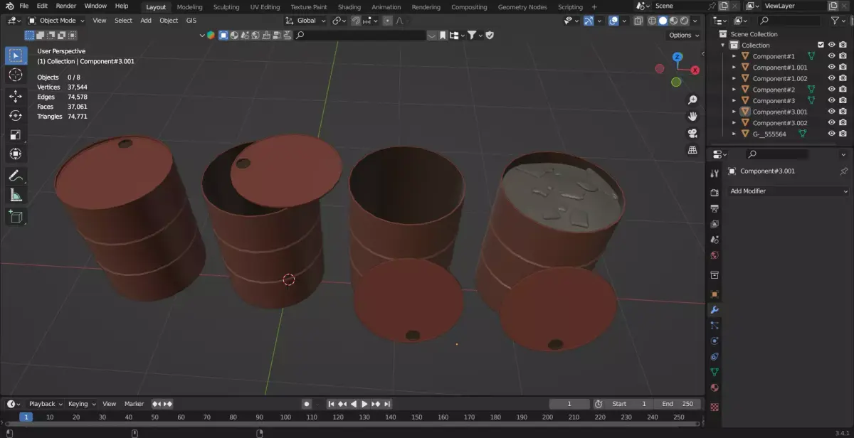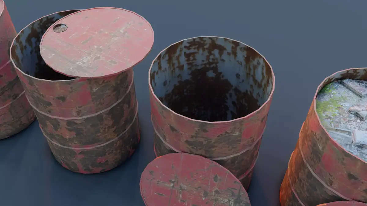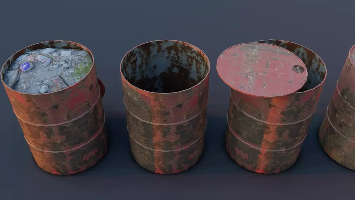 This pack includes four detailed rusty industrial barrels with realistic weathering, dents, scratches, and** PBR** texture maps. Each barrel is carefully UV-unwrapped and fully optimized for real-time rendering in game engines. The set features variations with open lids, closed lids, and heavy surface damage for added realism. All models maintain clean topology and are suitable for games, environment design, cinematics, and industrial scenes.