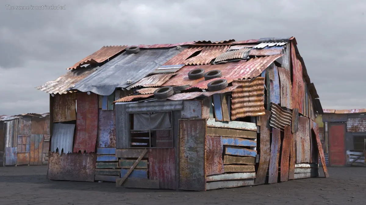 Rusty Sheet Metal Huts Collection 2 is a set of three-dimensional models of rustic, makeshift dwellings constructed from various reclaimed materials, particularly corrugated metal sheets.