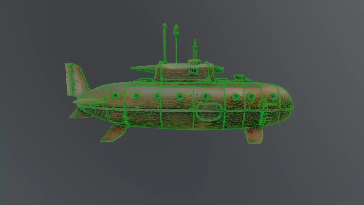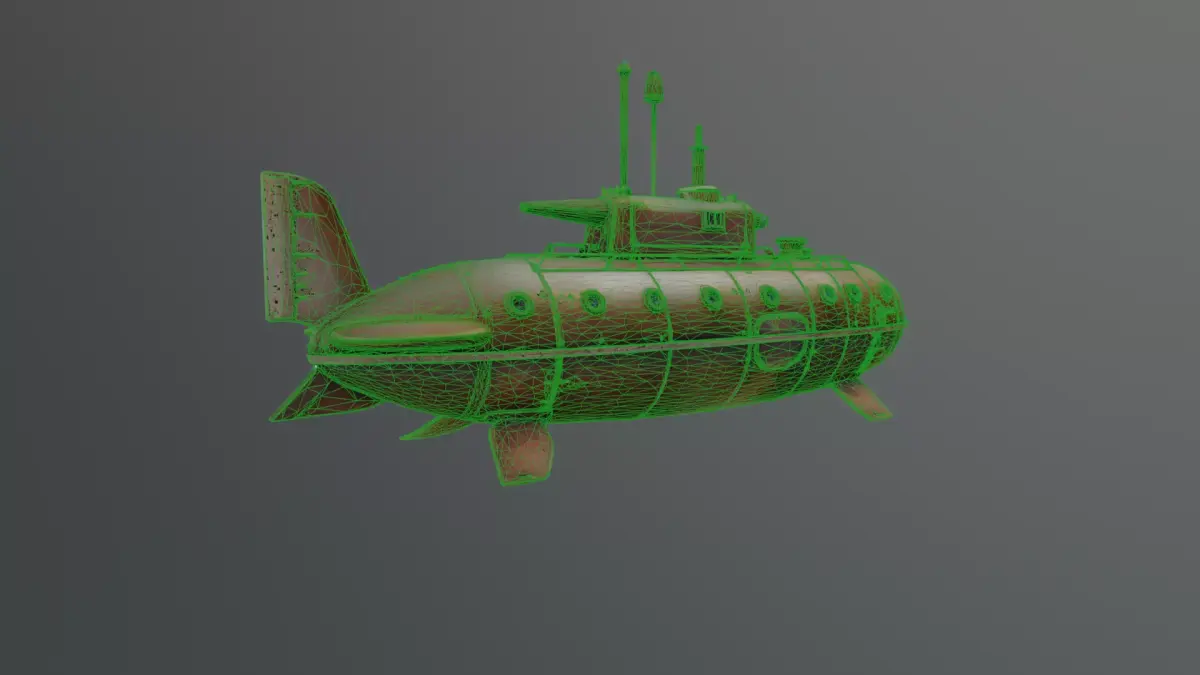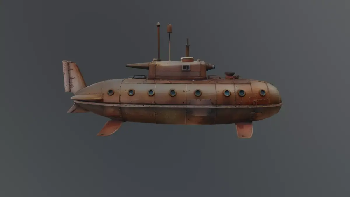 Stylized vintage submarine 3D model with a compact, retro-industrial design. Features detailed hull plating, rivets, portholes, and weathered metal textures for a worn, realistic look. Optimized for games and real-time use, suitable for underwater scenes, steampunk environments, or stylized naval settings