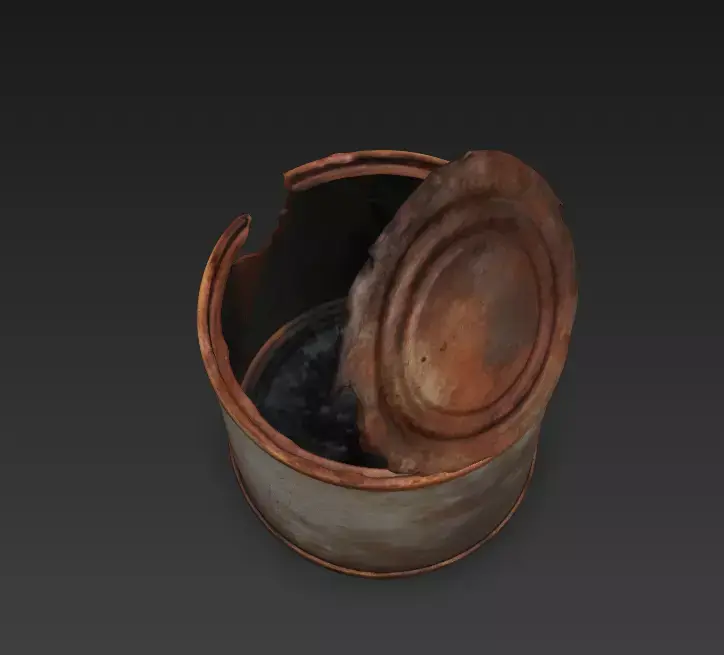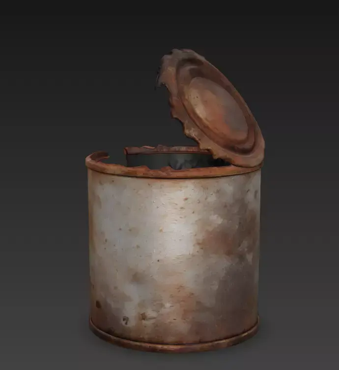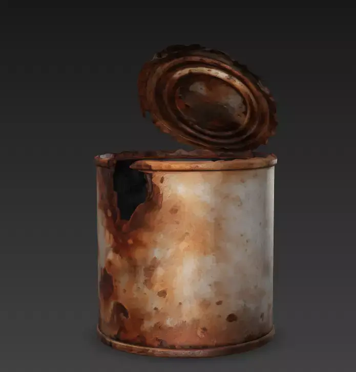 The model accurately captures the weathered decay of oxidized metal, featuring a physically accurate torn lid and jagged, bent edges that are incredibly difficult to replicate by hand.