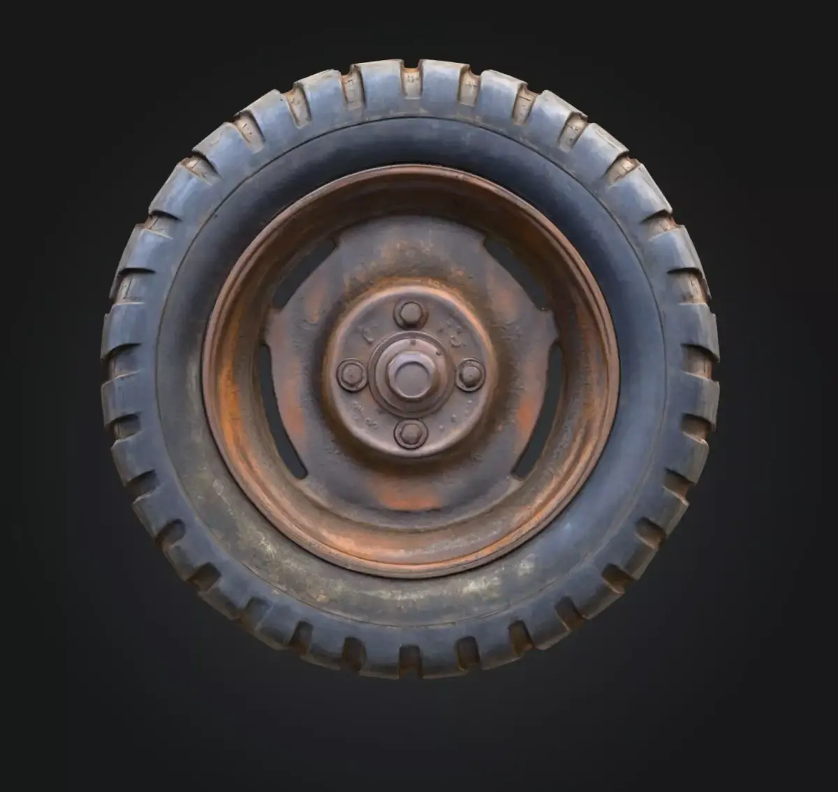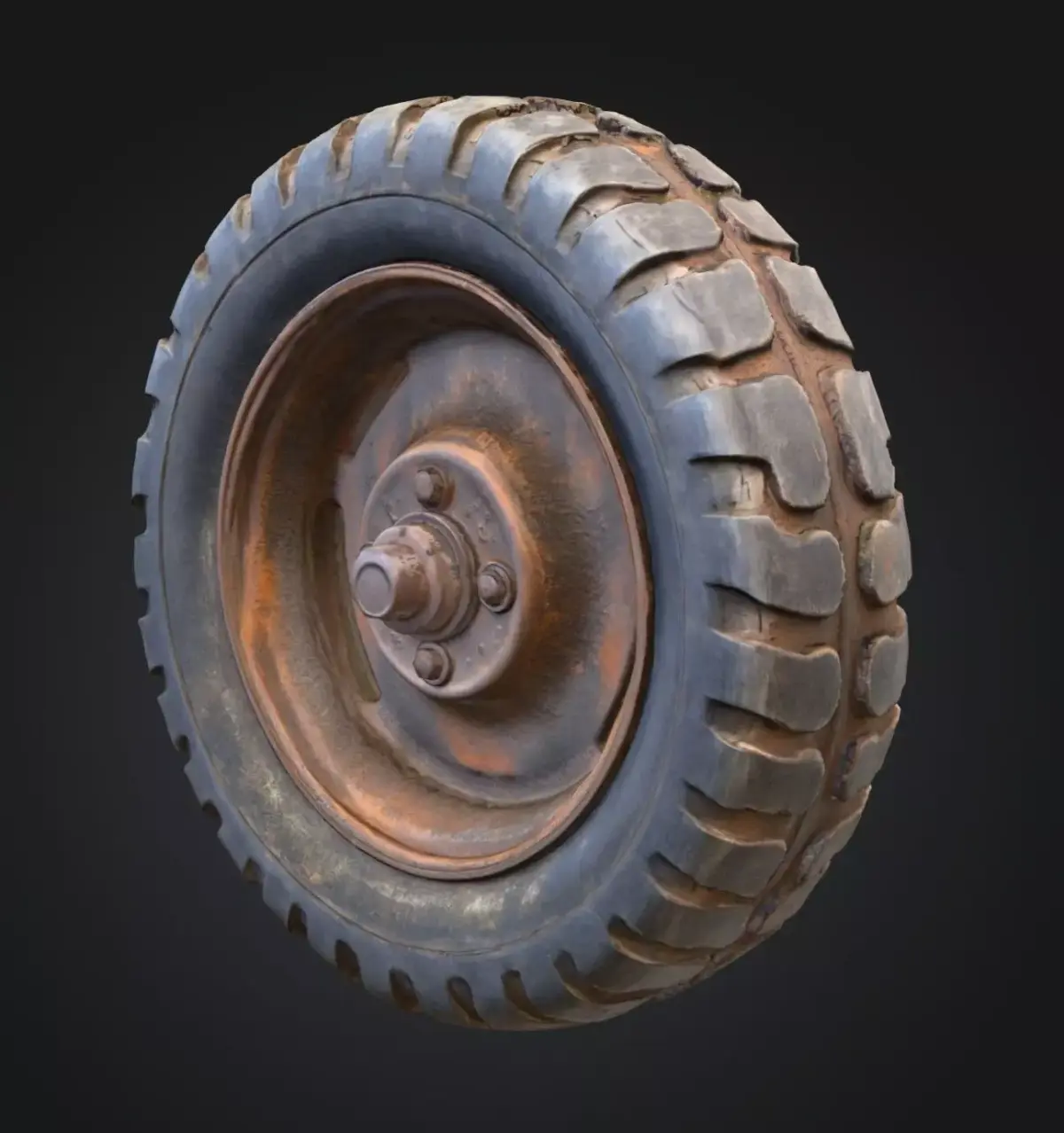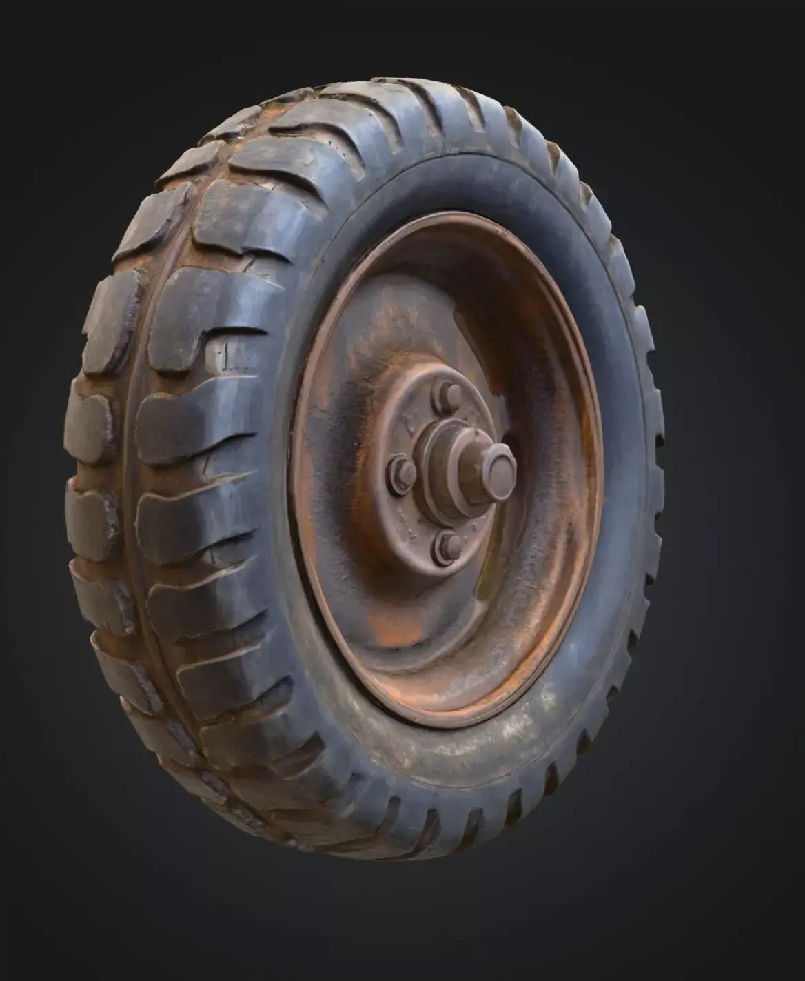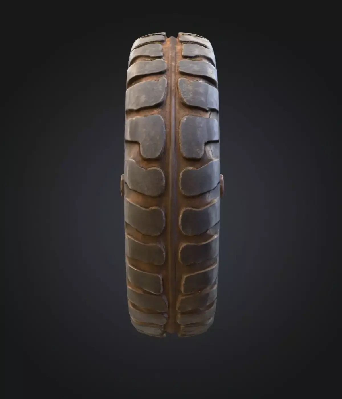 Detailed 3D model of an aged tractor tire featuring realistic worn rubber and rusty rim texture. Ideal for rural, post‑apocalyptic, or garage environments in games or cinematic renders. Includes baked normal maps and low‑poly optimization for real‑time use.