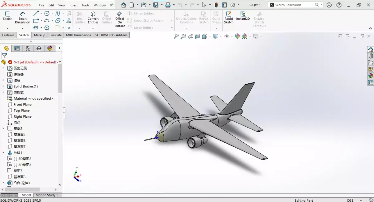 A simple model of S-3 anti-submarine aircraft jet.Built very near to scale by solidworks.S-3 anti-submarine aircraft,nicknamed Viking,is the first jet-powered anti-submarine aircraft in the world.It was developed by Lockheed Martin and entered service with the U.S.Navy in 1974 to replace the older Grumman S-2.Ideal for aerospace education,historical military projects,3D printing,and virsual simulation environments.