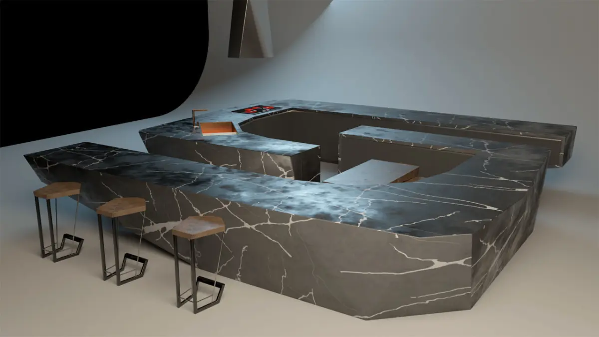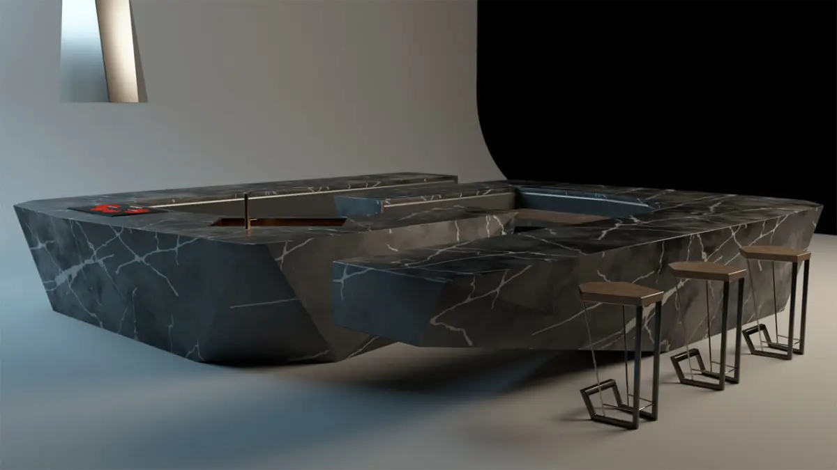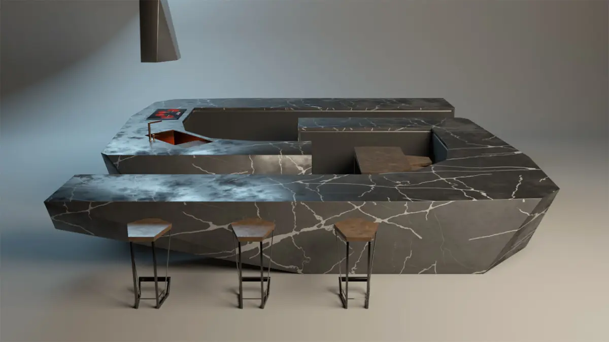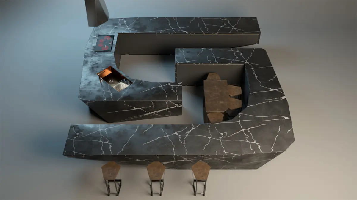 'S' shape unique kitchen with full body black and white marble materials and renderings.