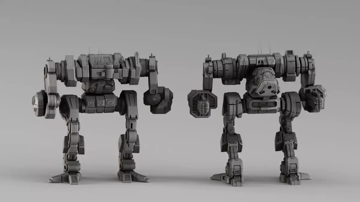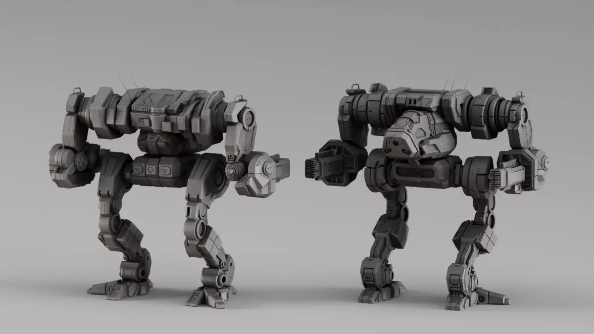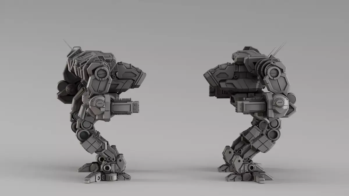Highly detailed industrial-style mech walker designed for 3D printing, featuring a heavy armored structure and complex mechanical detailing.