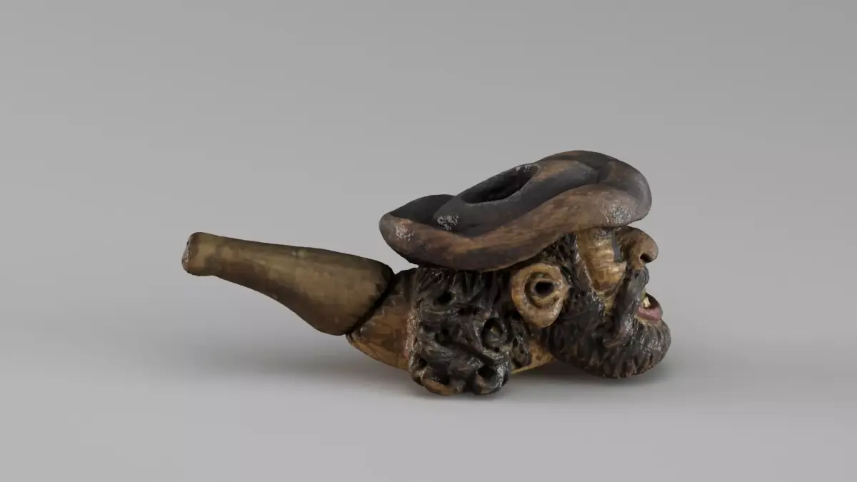 Highly detailed 3D model of a vintage carved pipe depicting the expressive head of a bearded man in a hat.Created using 3D scanning technology, the model preserves the authentic surface texture, handcrafted imperfections, and realistic patina of the original artifact.Perfect for CG visualization, museum reconstruction, film props, or artistic rendering projects requiring lifelike historical objects.Suitable for close-up renders, VR/AR environments, and scene compositions.
