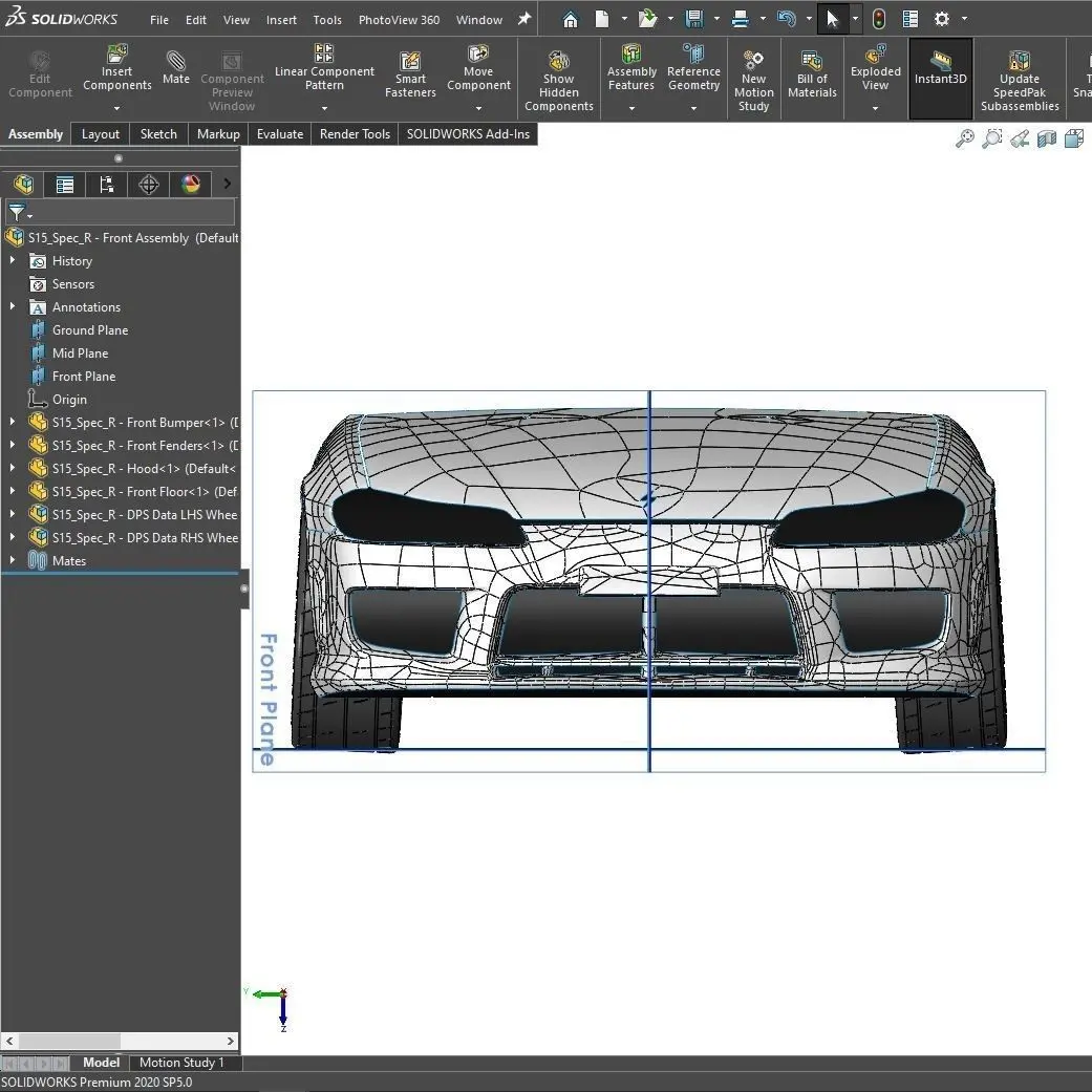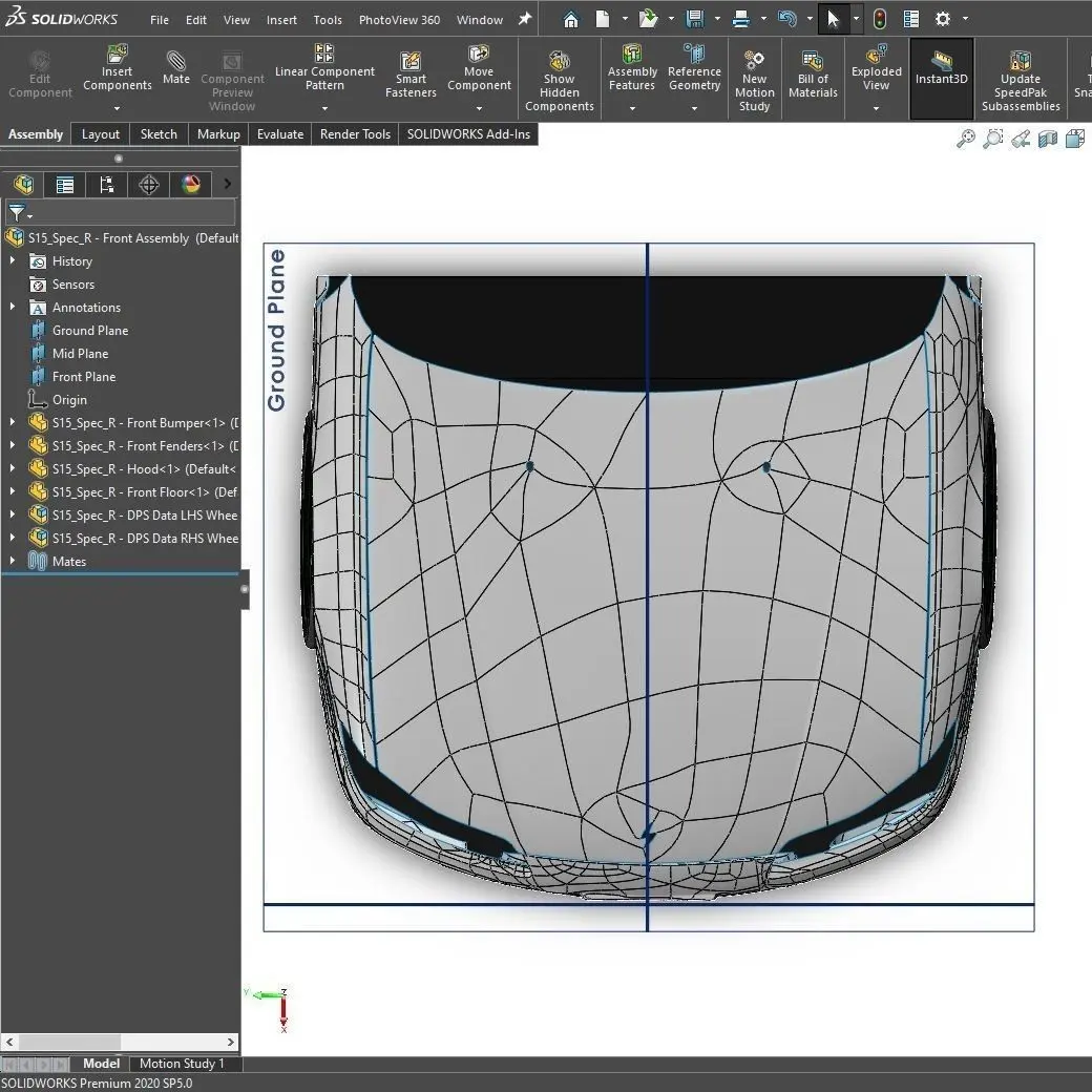 S15 Spec R Front End Surface assembly model in both SolidWorks 2020 & Parasolid file formats ready for import into most CAD systems. This assembly model is intended to help empower designers/enthusiasts looking for accurate data to design modifications such as front splitters/canards/fender vents/hood vents/overfenders/etc. for their cars. This model shares a common coordinate system with the other S15_Spec_R models by DPS Data, allowing assembly of front/rear or full exterior surface assemblies by combining the components together. Expected dimensional variance in the data vs the real-life car is typically between 150-250 microns (0.006”-0.01”) with the methods used to create this model.Included in this download: SolidWorks 2020 & Universal Parasolid File Formats for each.[S15_Spec_R - Front Assembly] assembly file.[S15_Spec_R - Front Bumper] component file.[S15_Spec_R - Front Fenders] component file.[S15_Spec_R - Hood] component file.[S15_Spec_R - Front Floor + Wheel Mounts] component file.[S15_Spec_R - DPS Data LHS Wheel Assembly] assembly file.[S15_Spec_R - DPS Data RHS Wheel Assembly] assembly file.[DPS Data Wheel Variant 4 - S15_Spec_R] component file.[DPS Brake Rotor - FL - S15_Spec_R] component file.[DPS Brake Rotor - FR - S15_Spec_R] component file.