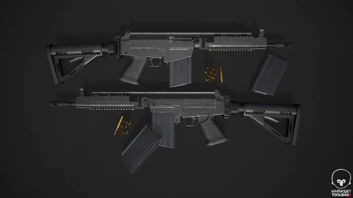 Comes with 4096x4096 texture maps of a PRISTINE version and ROUGH version, split between the rifle, magazine, and bullet. The texture maps come with PBR Metal & Roughness, Unreal Engine 4, Unity Engine 5, and DayZ/Arma textures.