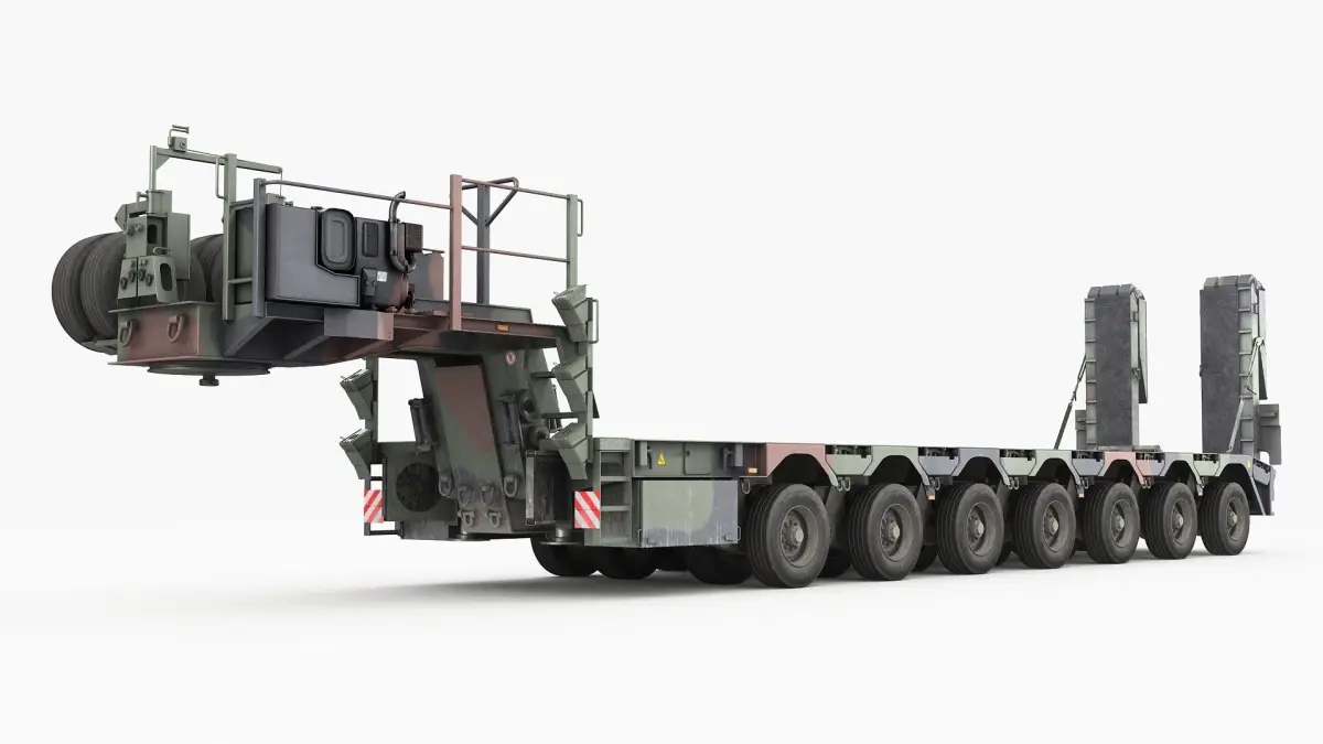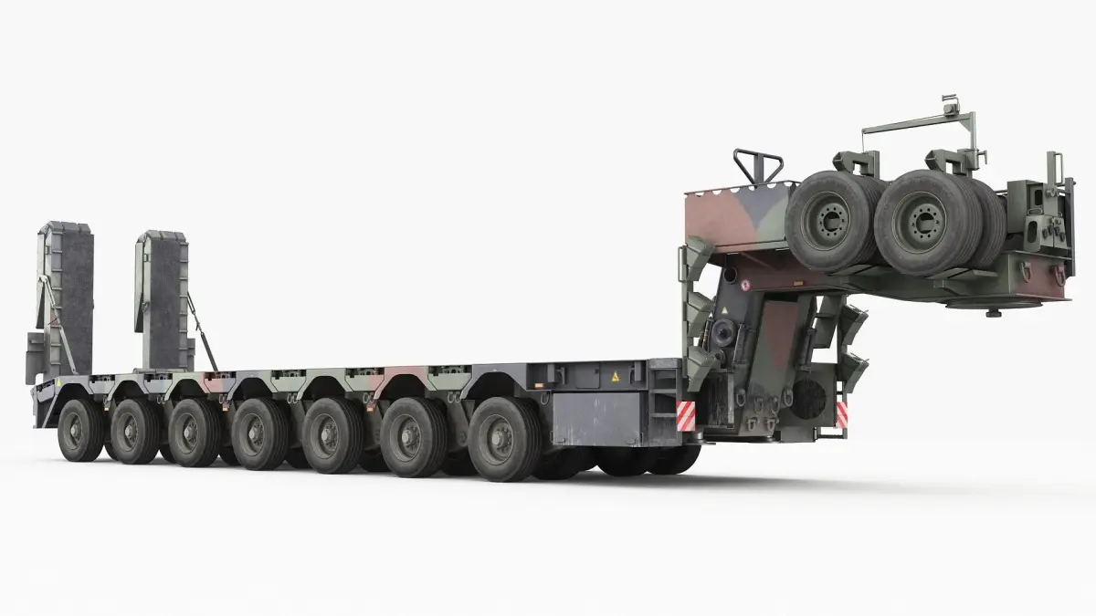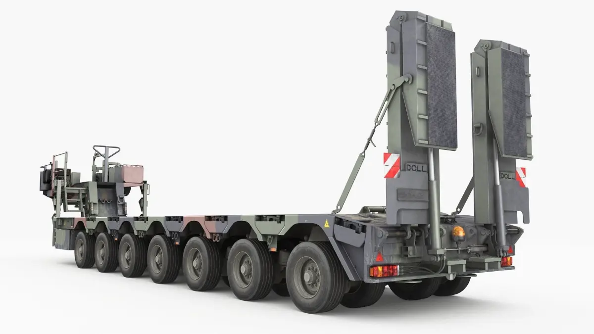 SaAnh 70t semi-trailer has seven pendulum axles with twin tires on each side, of which the first two and the last four are steerable to reduce turning circle and tire wear. Each of these axles adapts to any uneven ground, making the semi-trailer fully off-road. The compensating gooseneck also contributes to this.The hydraulic supports make it possible to park even a fully loaded trailer. In addition to vehicles, this trailer can also transport containers up to 20 foot.