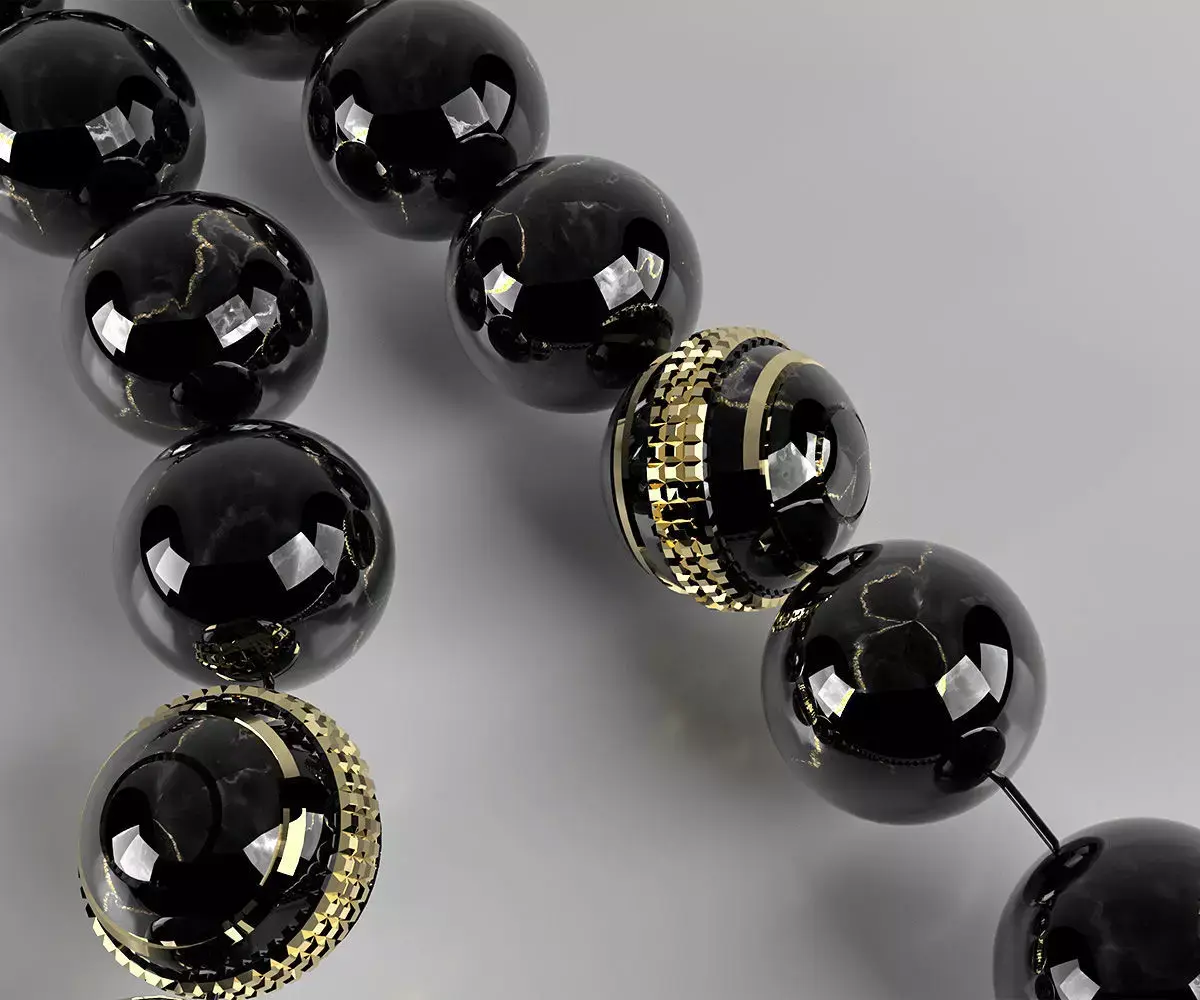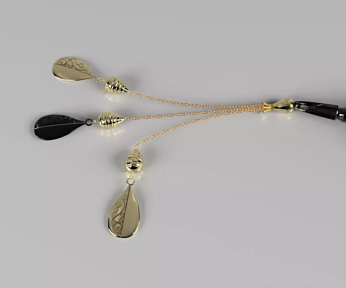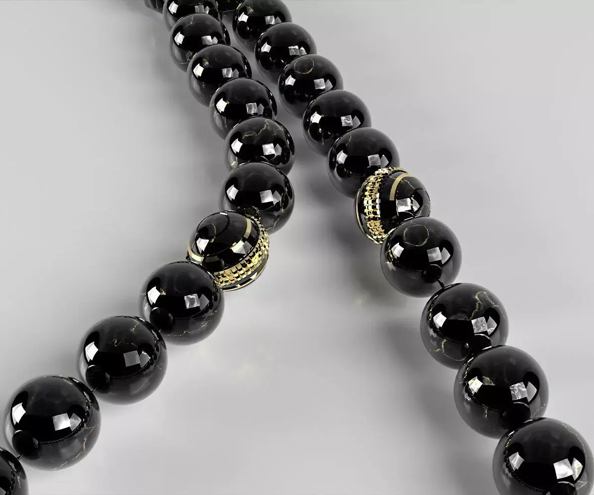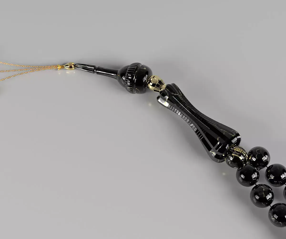 An elegant prayer bead crafted from premium black Aqeeq stone, accented with golden beads and beautiful ornamentation, with refined details that add charm and timeless elegance.