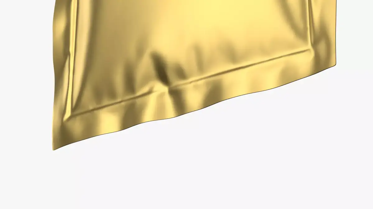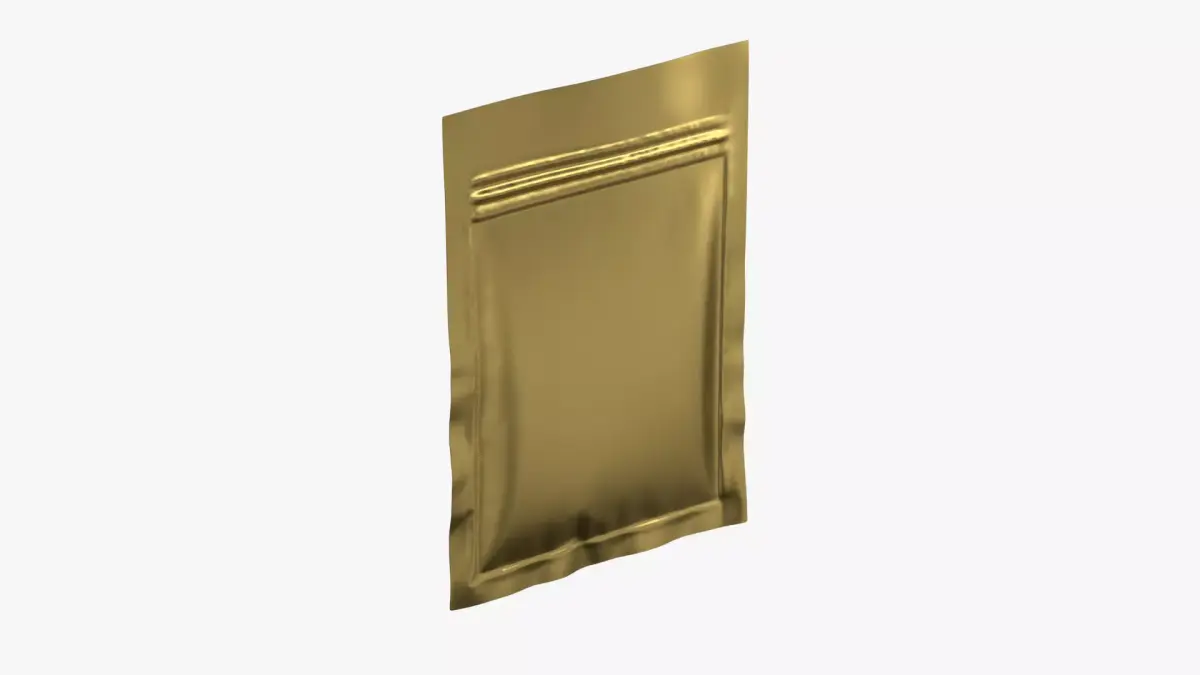 Photorealistic 3D mockup of a flat gold foil sachet — ideal for premium single-use packaging such as luxury cosmetics, skincare samples, pharmaceuticals, coffee, tea, sauces, spices, sugar, and hotel amenities. Realistic metallic reflections and soft crinkles make it perfect for high-end branding presentations.