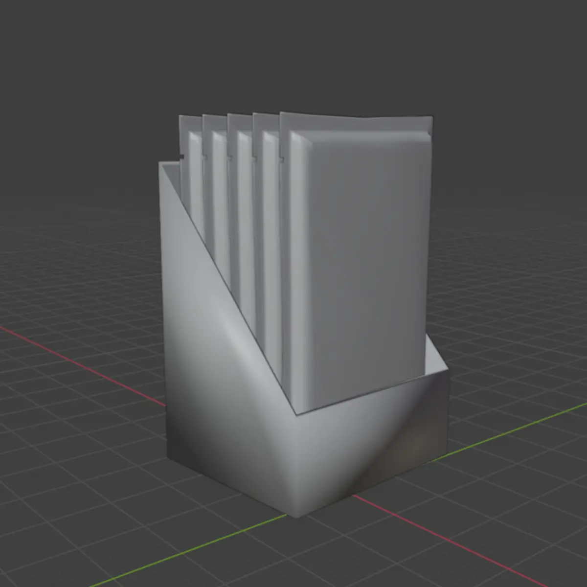 5-pack 3D food pouches with their display box or container.Three-dimensional object designed to simulate a flexible container used to hold liquid or semi-liquid food. The pouch is created for advertising purposes and used as a mockup in advertisements and promotions. This 3D model captures every detail of the package, including its shape, size, colors, and graphic design.