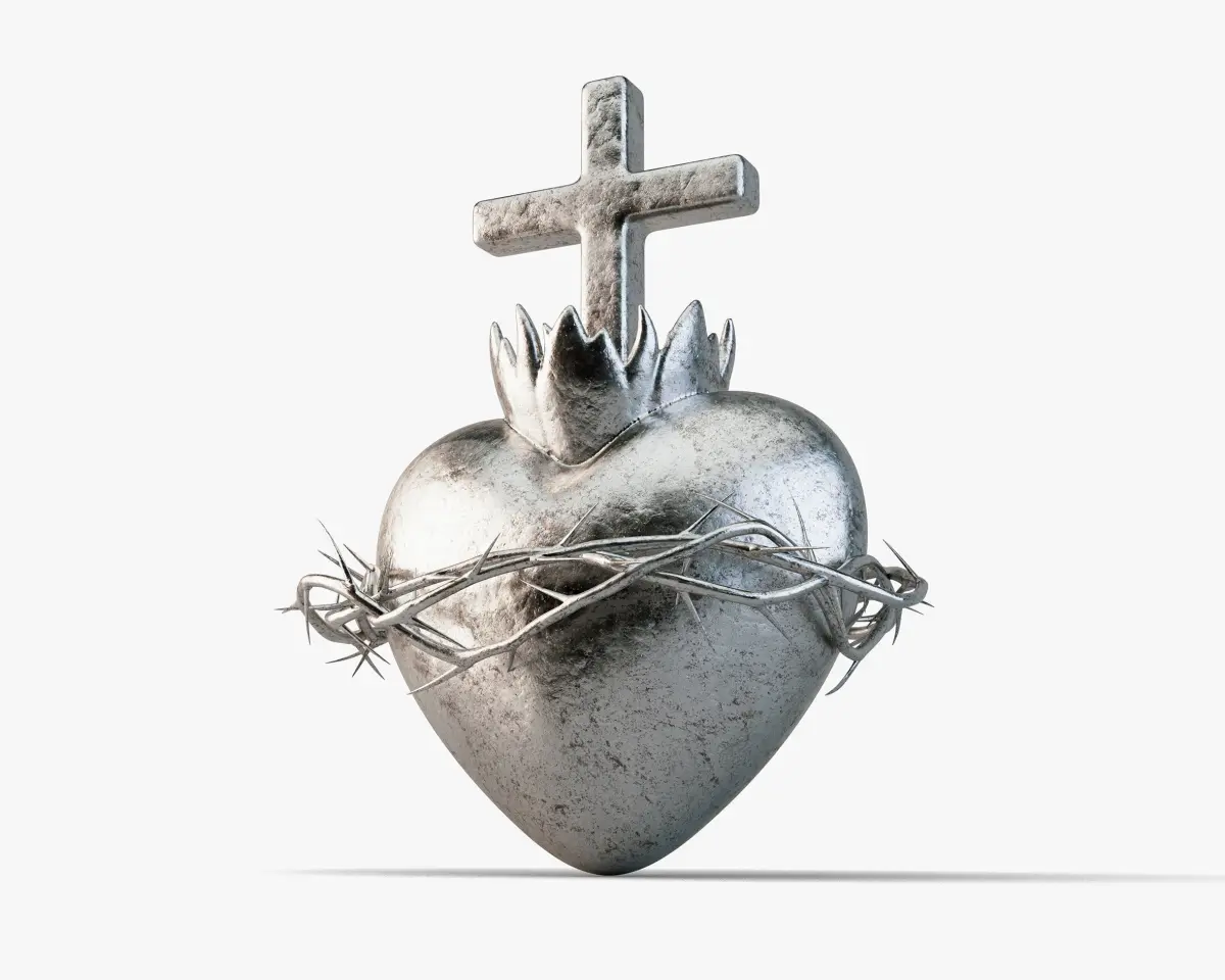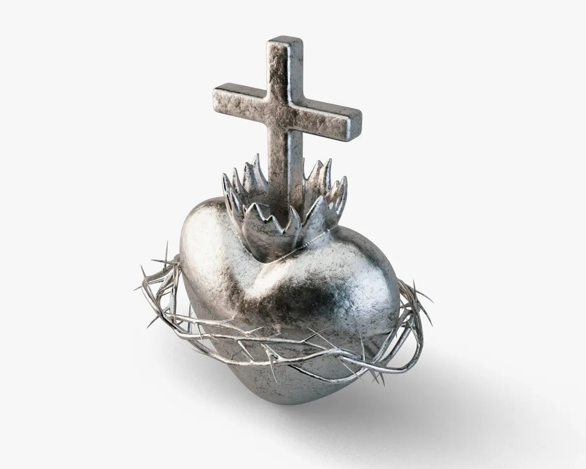 An iron casting of the sacred heart of jesus showing a crucifix, flame and crown of thorns.Contains procedural and parametrized meshes which may translate to higher poly count than stipulated if converted to other formats.