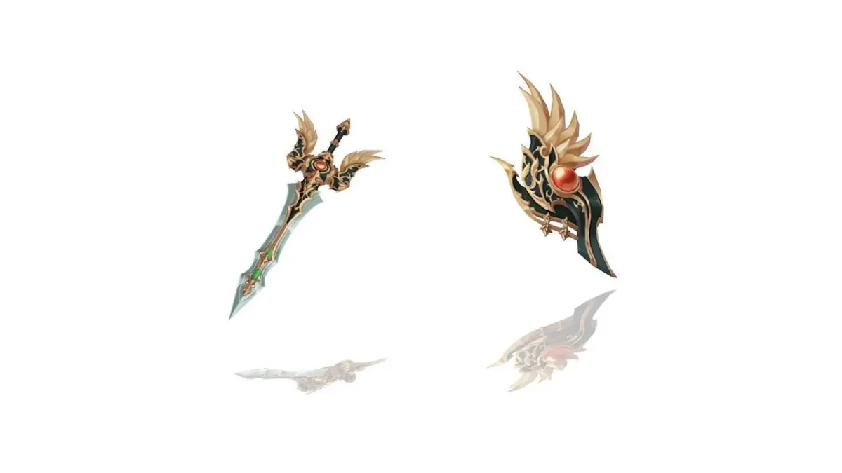A set of a sword and a shield in a sacred/relic style that comes with two variants, for the price of only one model.