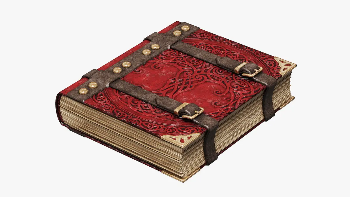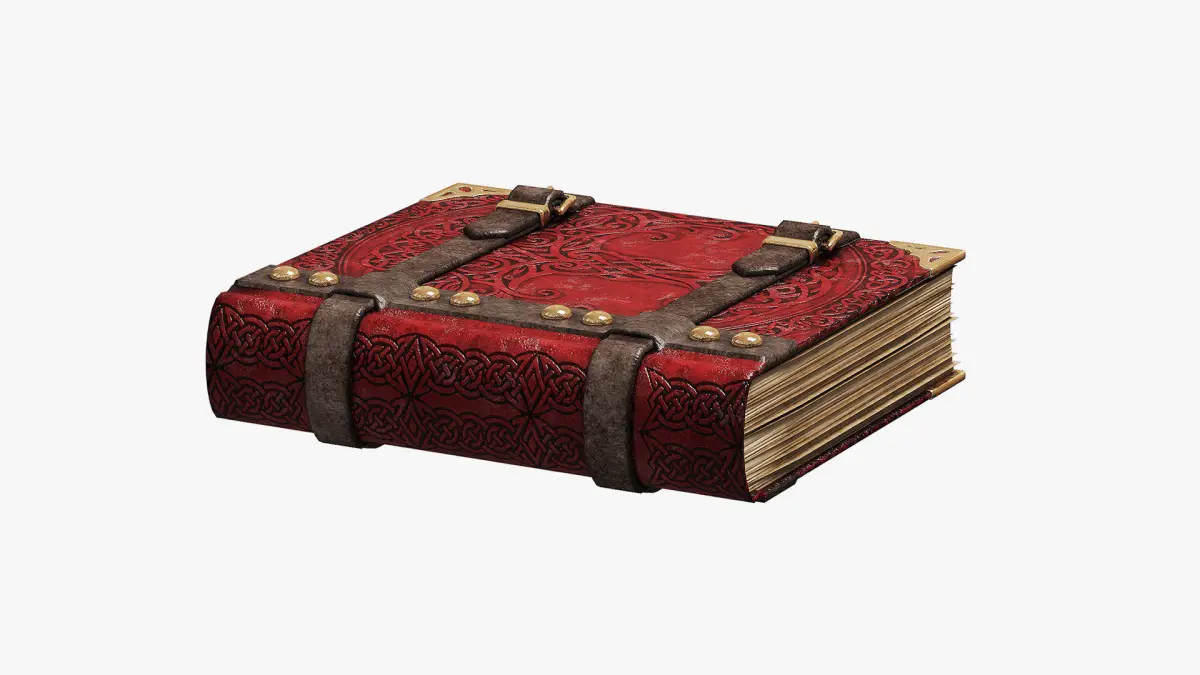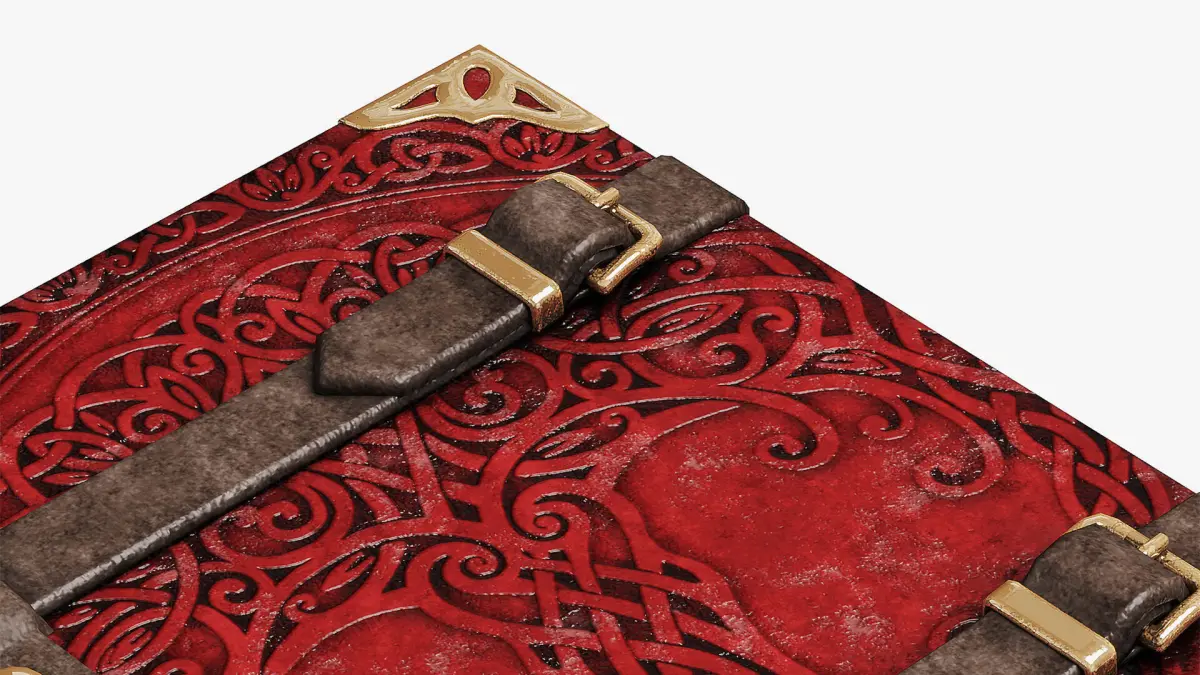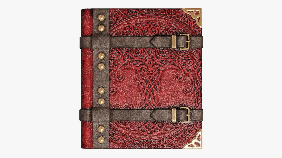 Decorative book in a red leather cover with Celtic ornaments. Additionally decorated with metal rivets and corners, there are straps. The pages are aged.