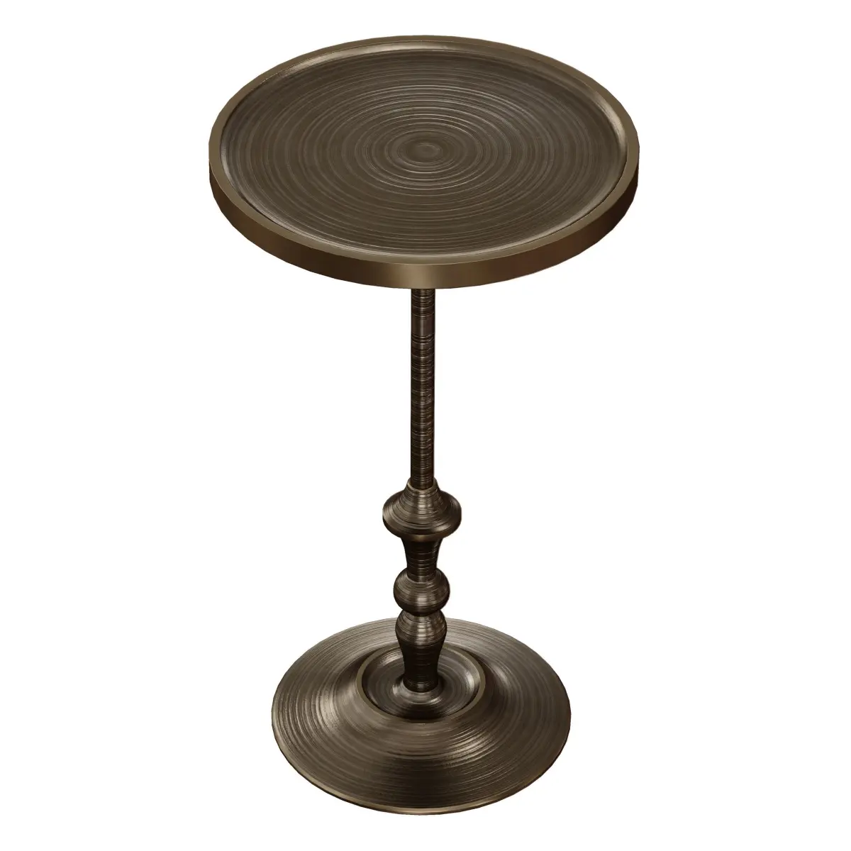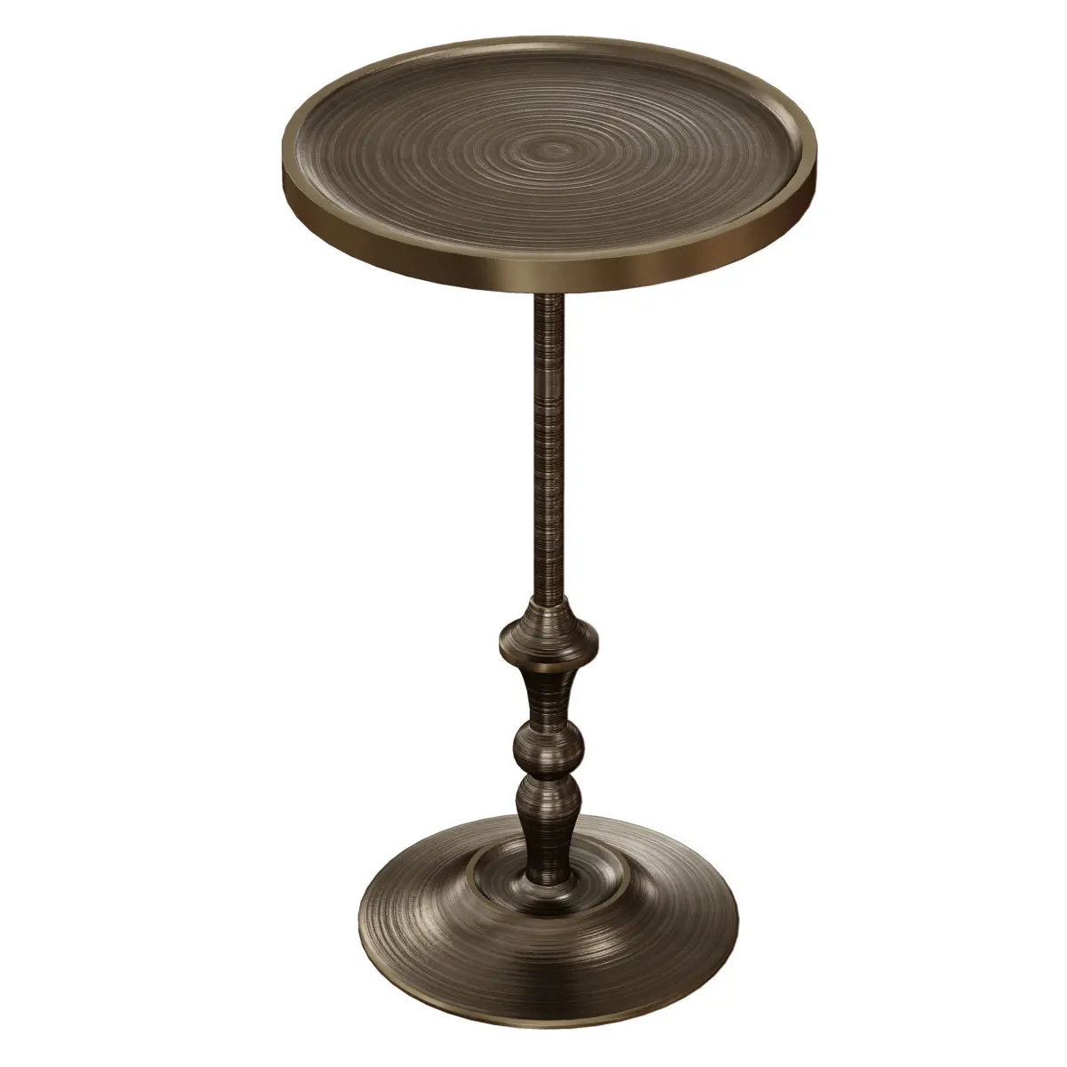 Description of seller:OverviewDiminutive and decorative, Sadie provides just enough room for a drink or two. Handcrafted to resemble a traditional candlestick, the aluminum table has an all-over ribbed texture to bring out the highlights of the antique brass finish.A turned base and subtly coupe-shaped top adds to the drink table's retro appeal.Overall DimensionsHeight: 20.5 Diameter: 12