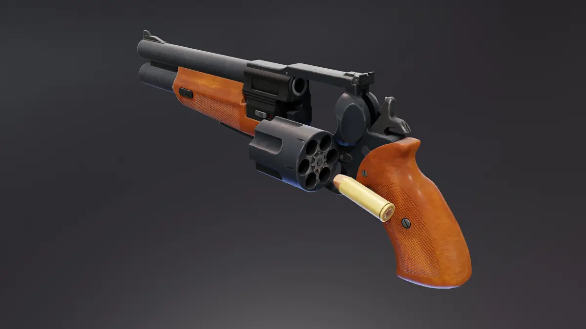 Safari 12 is a pretty interesting concept but just like its younger brother Safari 13, it's just a prop gun made in Japan by a user named Bison. As far I we could see more images of version 13 and its top-break opening mechanism I could not find much about 12 so I just made up how it would work... and that is, lower 30-06 round would be inserted by moving whole handguard forward with two locking buttons in front, when cylinder with 454 is classic and easy to use swing-out.Oh... I also added top picatinny rail for scope and 12g variant for lower barrel, for that extra spread...