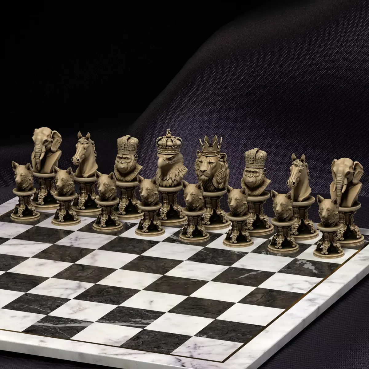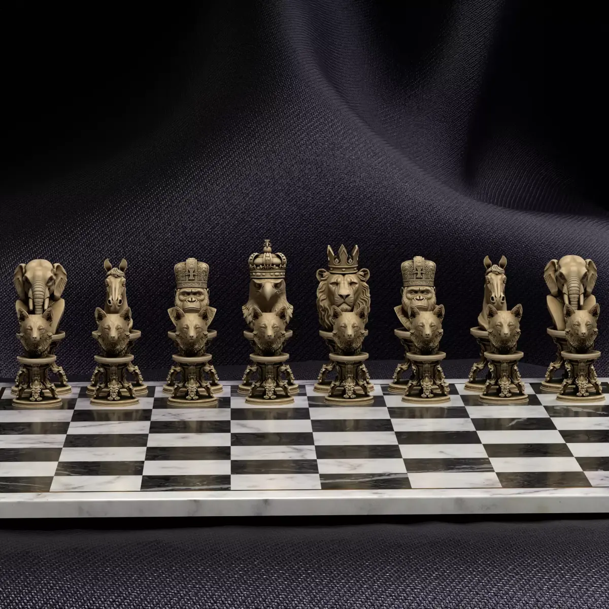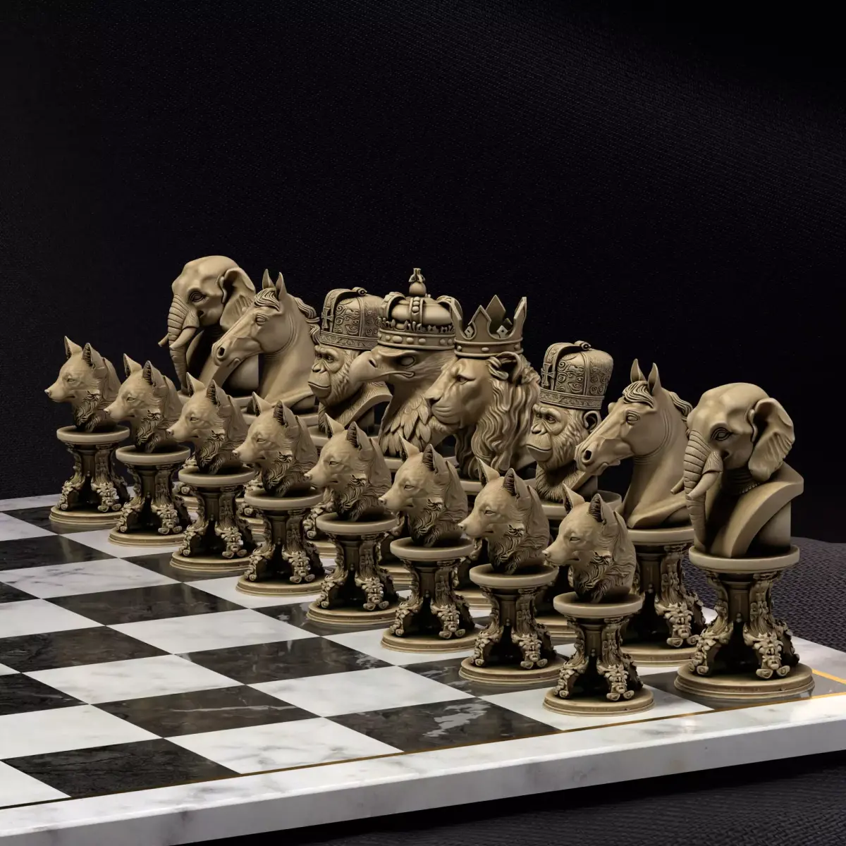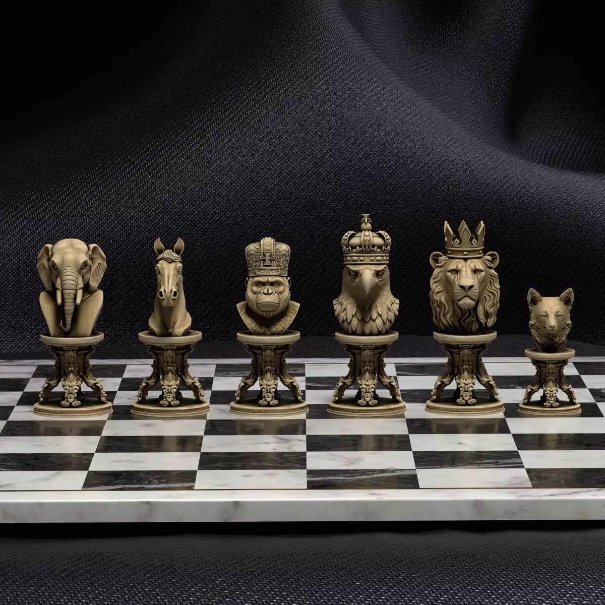 The kings of the wild wear crowns! This majestic bundle presents 6 crowned animal busts – lion, eagle, gorilla, elephant, horse, and wolf – on beautifully carved pedestals for an unforgettable wildlife chess experience.