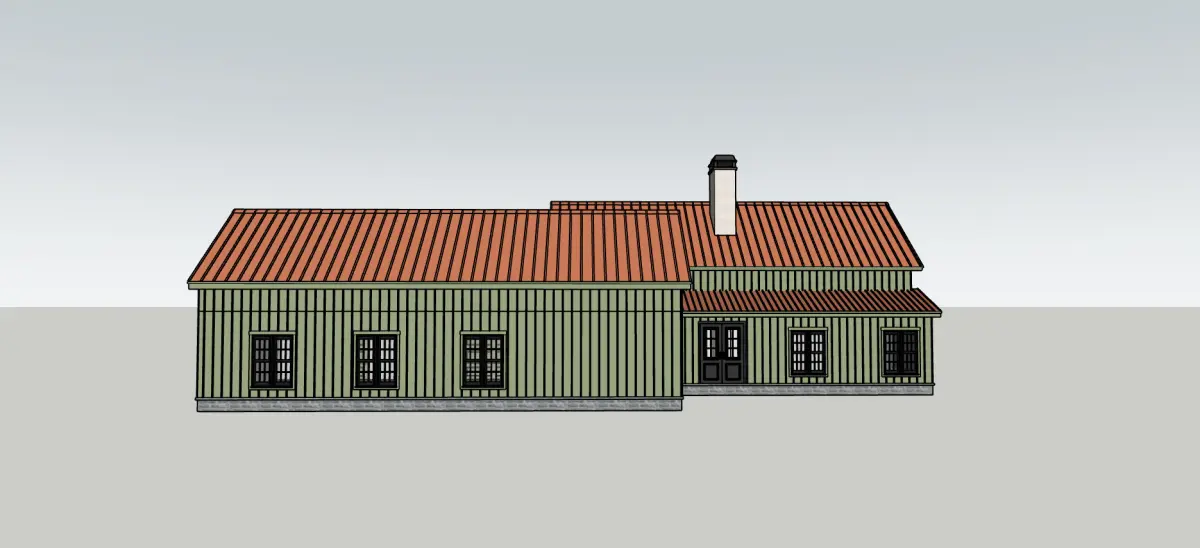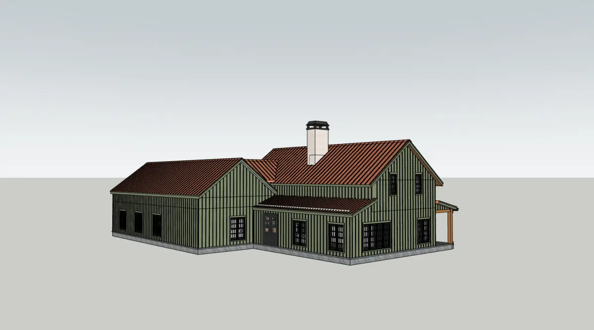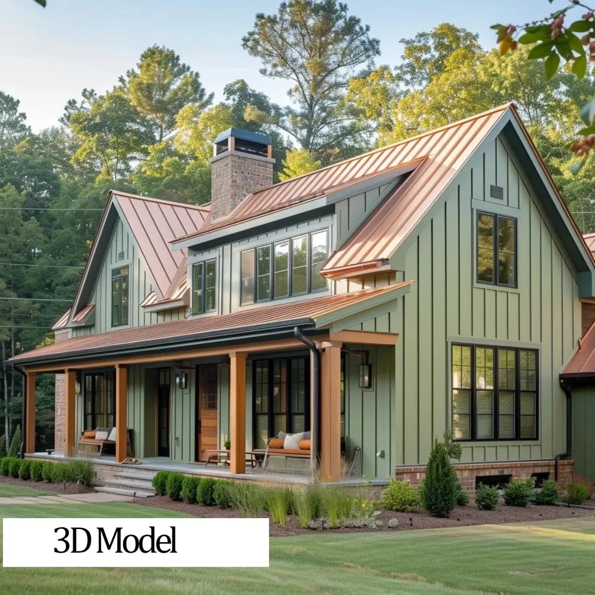 This stunning 3D house model blends classic farmhouse elements with a fresh, modern touch. The copper metal roof pairs beautifully with the soft olive-green siding, while wooden porch posts seamlessly tie in the warm tones of the brick accents.