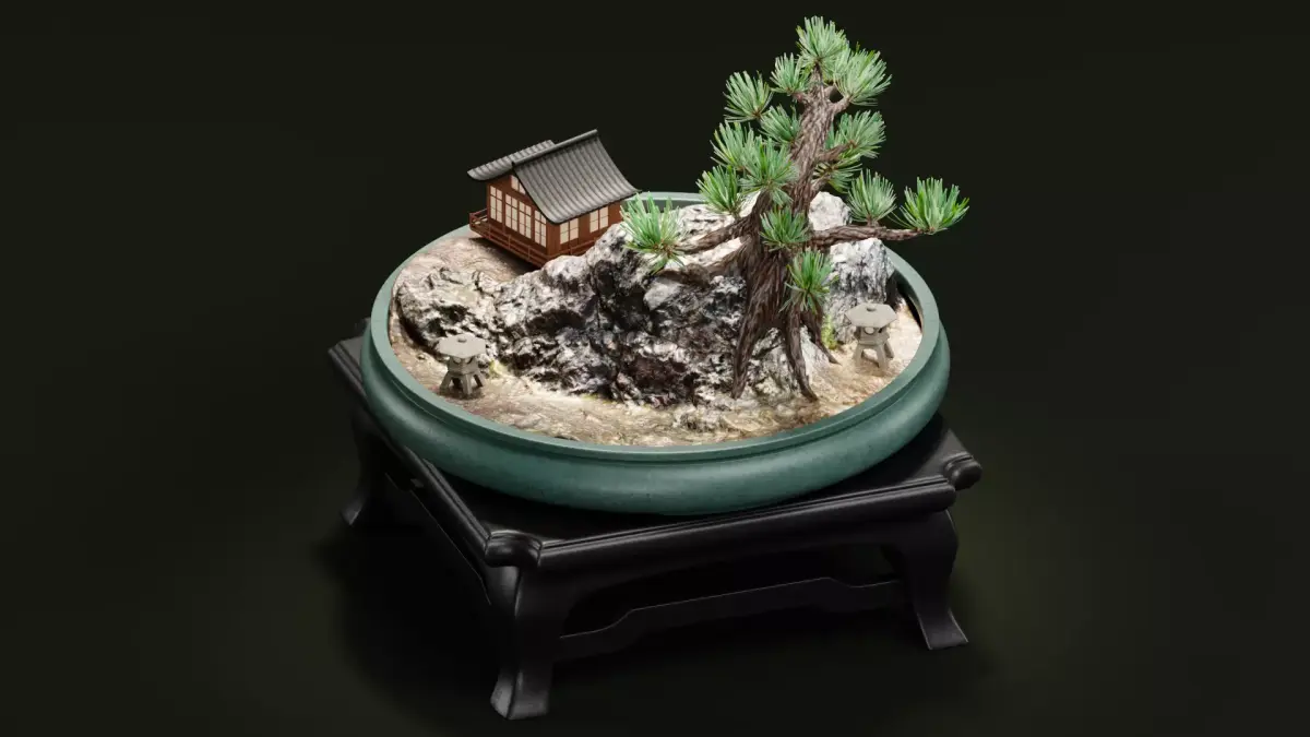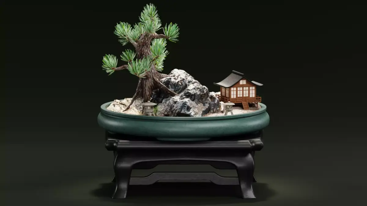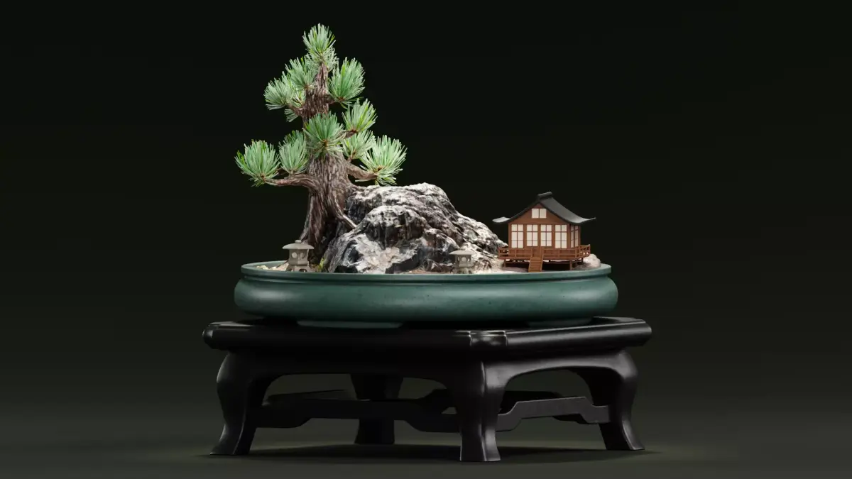 Highly detailed Japanese Saikei miniature garden 3D scene. The scene combines photogrammetry assets with hand-modeled elements for maximum realism and performance. Ideal for rendering, environment design, or animation projects requiring a tranquil and authentic miniature setting. The scene includes all major components of a traditional Saikei setup: bonsai table, bowl, pine tree, rocks, toro lantern, and miniature house — carefully arranged to create a balanced composition ready for rendering or customization.